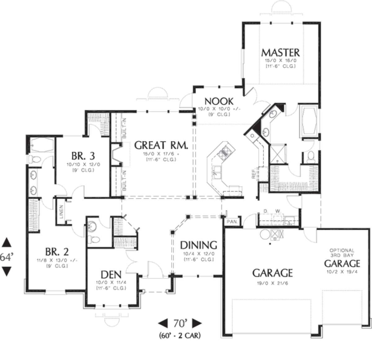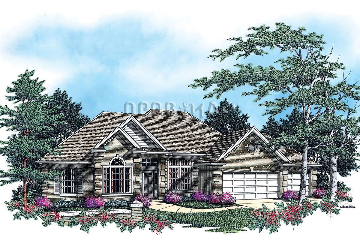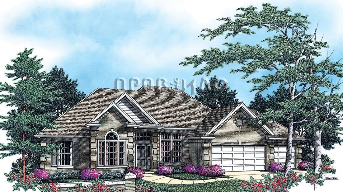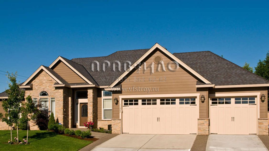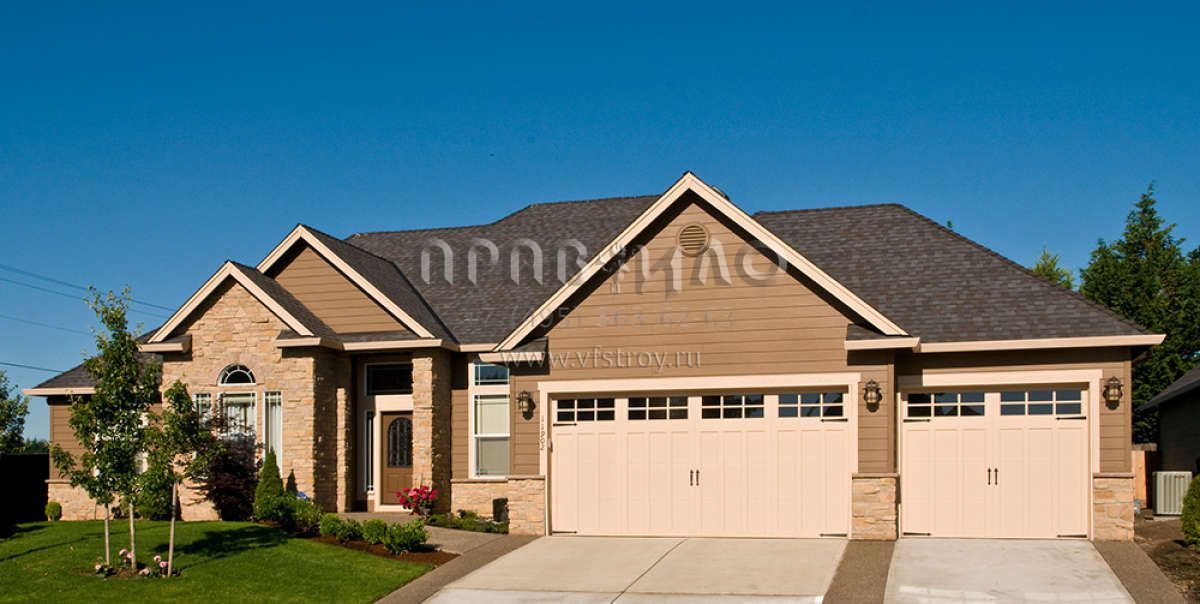 Это проект одноэтажного дома с гаражом на две машины жилой площадью 204 кв.м. Длина дома 19.5 м, ширина 18.3 м, высота 7.9 м. В доме четыре спальни и два санузла.