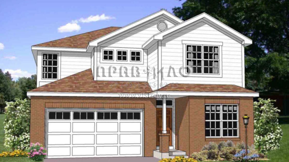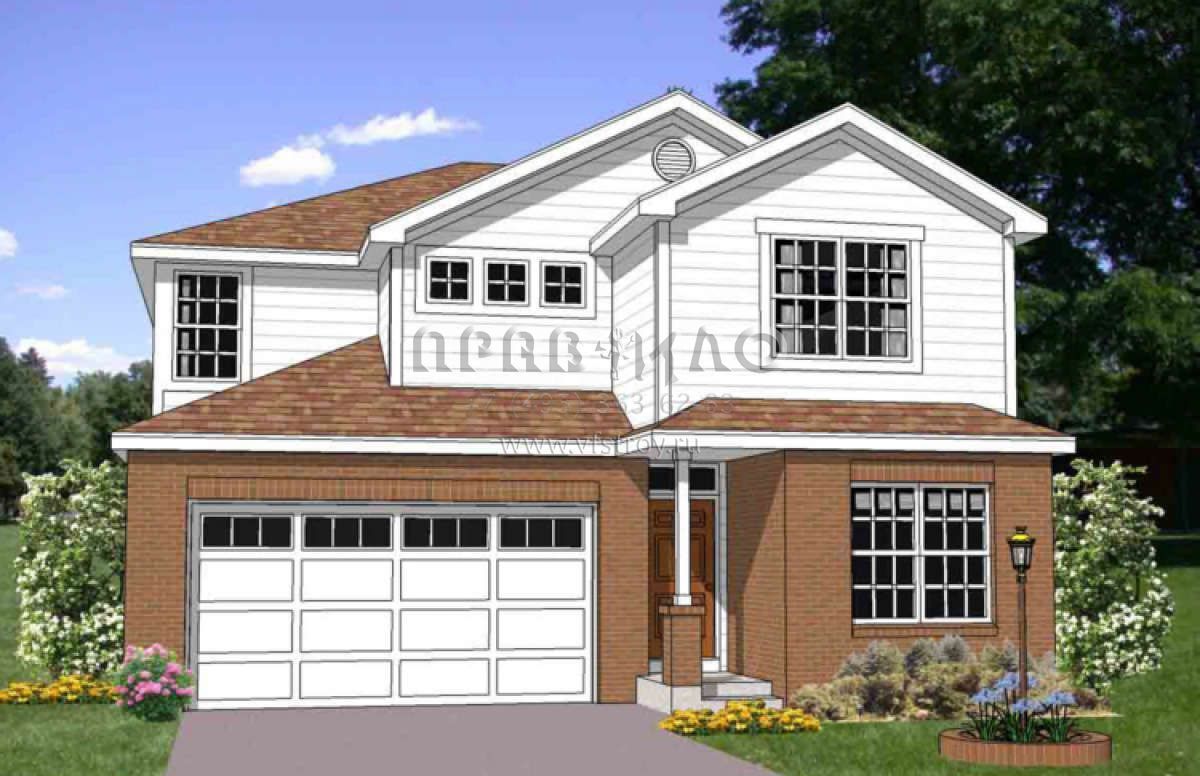 Это проект двухэтажного дома с гаражом на две машины жилой площадью 204 кв.м. Длина дома 14.6 м, ширина 10.7 м, высота 8.8 м. В доме три спальни и два санузла.