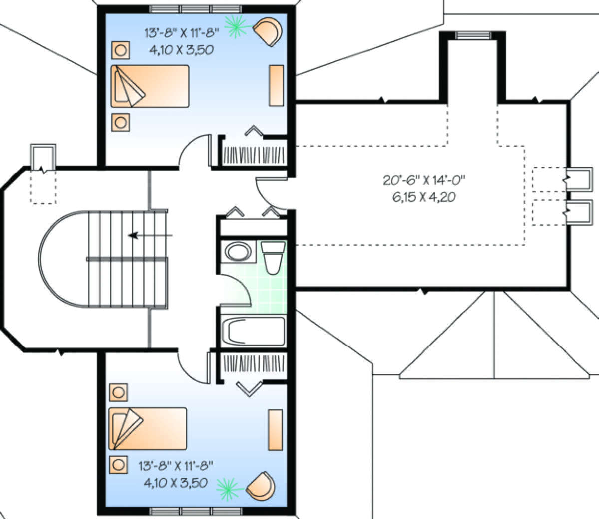 Двухэтажный проект дома позволяет рационально распорядиться площадью участка небольшого размера или узкой формы. На первом этаже находятся общие комнаты (гостиная/столовая, кухня, подсобные и технические помещения), на втором — спальни членов семьи.