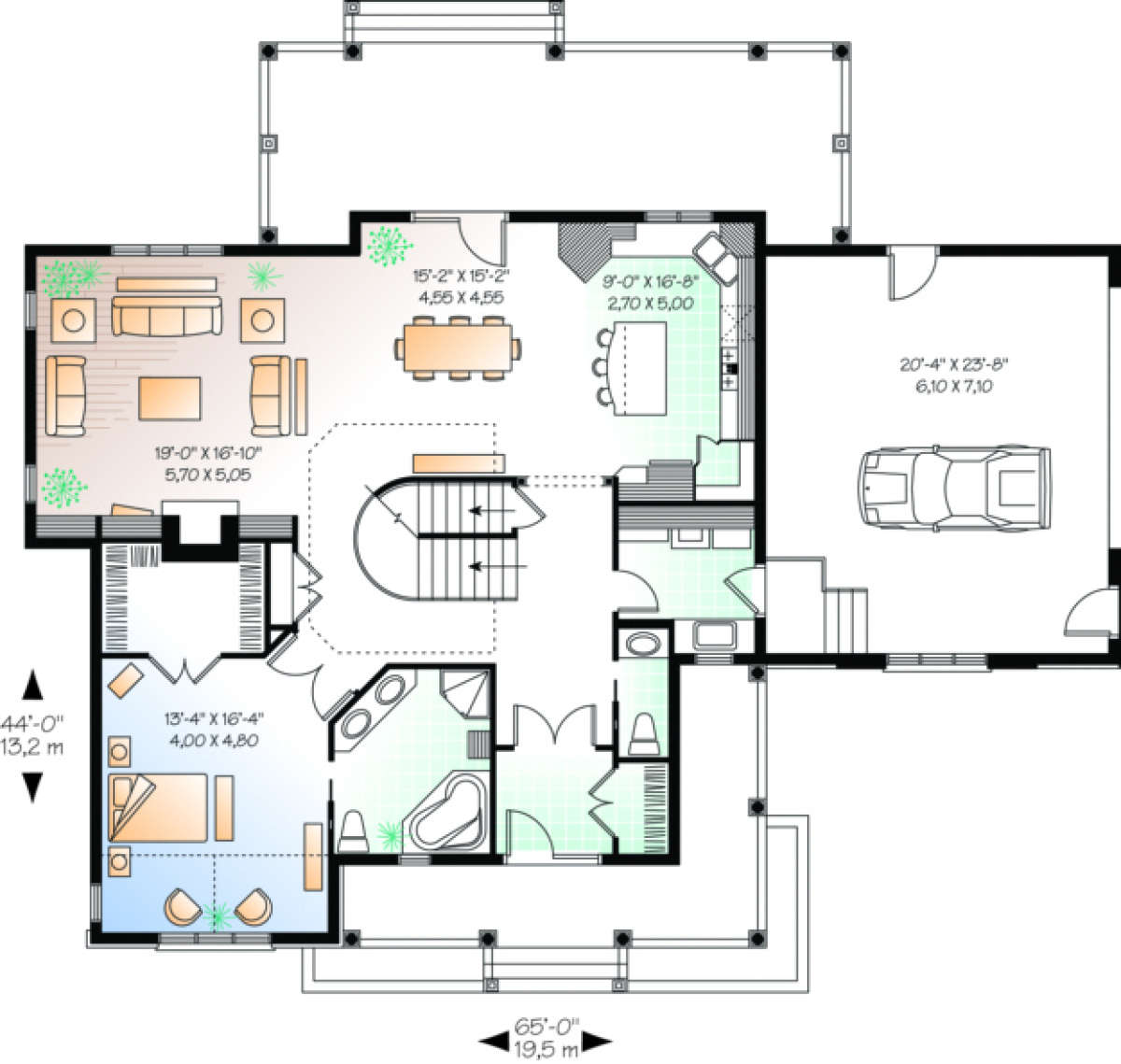 S5-205 (034-00022) Это иностранный проект, для которого требуется адаптация под нормы, действующие в Российской Федерации. Вы видите проект дома в стиле Ранчо. В этом доме сочетаются черты сельской постройки и аскетичность лофта. Внутри жильцы смогут проводить время с максимальным комфортом. Обратим внимание, что сейчас на планировках все размеры представлены в футах. Для перевода в метры вам необходимо значение в футах умножить на 0,3048.