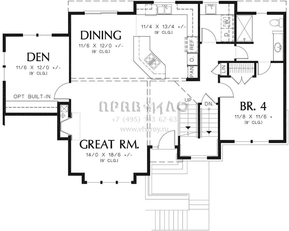 S5-206 (2559-00374) Это иностранный проект, для которого требуется адаптация под нормы, действующие в Российской Федерации. Вы видите проект дома в стиле Ранчо. В этом доме сочетаются черты сельской постройки и аскетичность лофта. Внутри жильцы смогут проводить время с максимальным комфортом. Обратим внимание, что сейчас на планировках все размеры представлены в футах. Для перевода в метры вам необходимо значение в футах умножить на 0,3048.