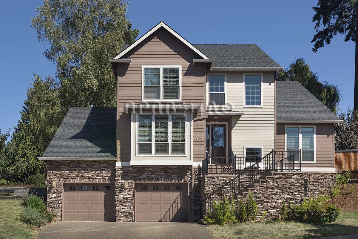 Это проект двухэтажного дома с гаражом на две машины жилой площадью 206 кв.м. Длина дома 10.4 м, ширина 15.8 м, высота 9.4 м. В доме четыре спальни и три санузла.