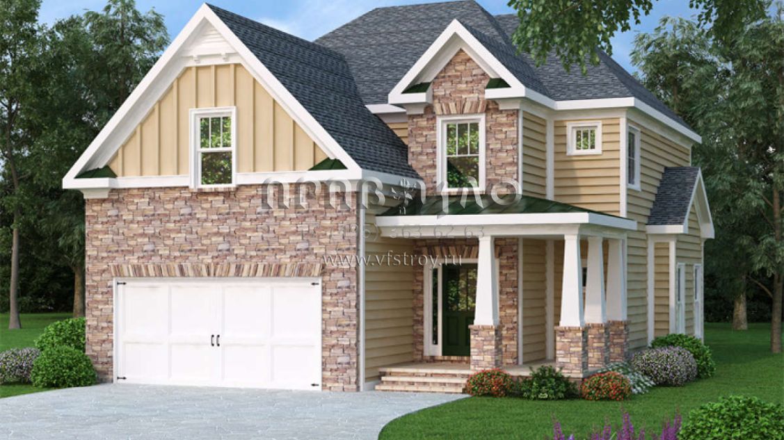 Это проект двухэтажного дома с гаражом на две машины жилой площадью 207 кв.м. Длина дома 15.8 м, ширина 11.3 м, высота 9.1 м. В доме четыре спальни и два санузла.
