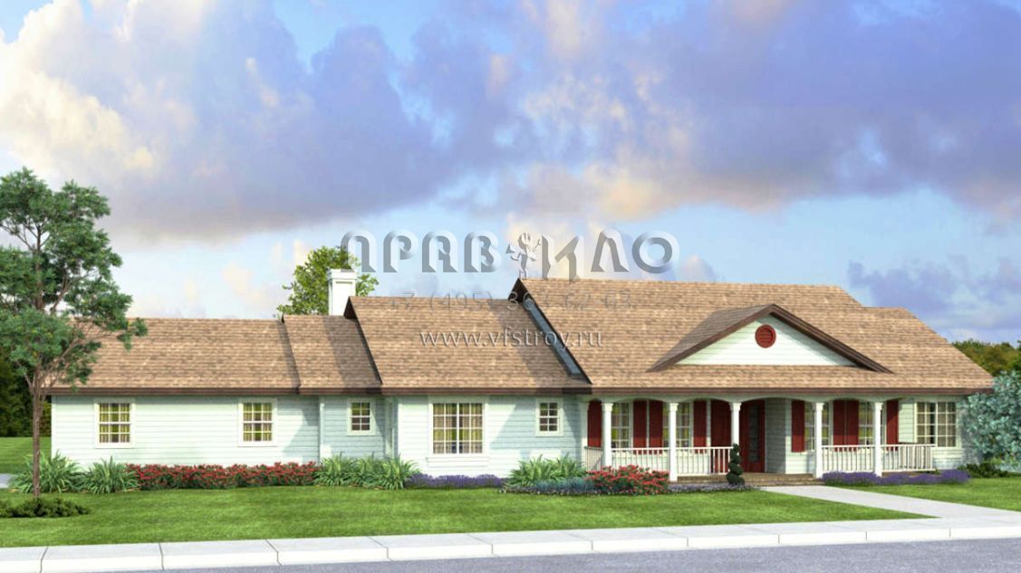 Большая площадь участка позволяет выбрать одноэтажный проект дома, особенно если в семье есть пожилые люди, инвалиды или маленькие дети.