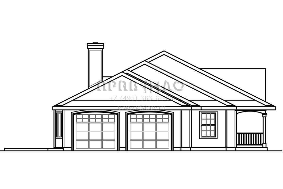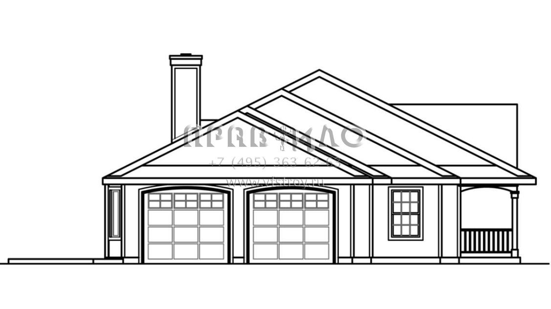 Это проект одноэтажного дома с гаражом на две машины жилой площадью 207 кв.м. Длина дома 13.1 м, ширина 28 м, высота 6.1 м. В доме три спальни и два санузла.