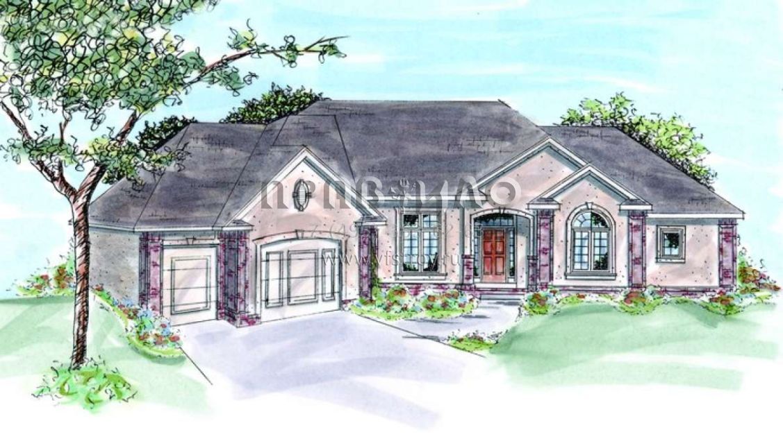 Это проект одноэтажного дома с гаражом на две машины жилой площадью 207 кв.м. Длина дома 18 м, ширина 28 м, высота 0 м. В доме две спальни и два санузла.