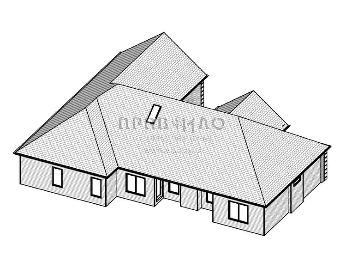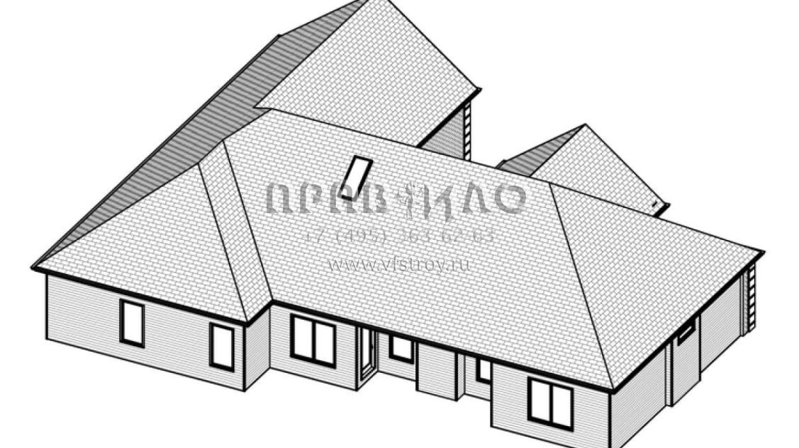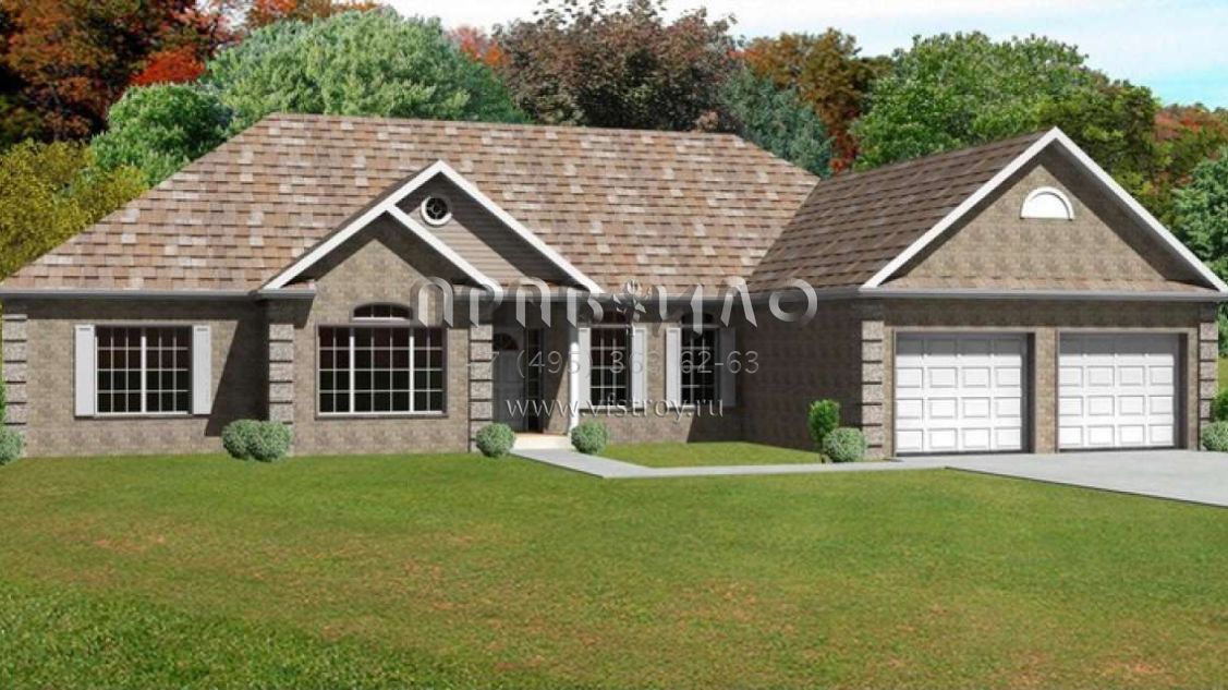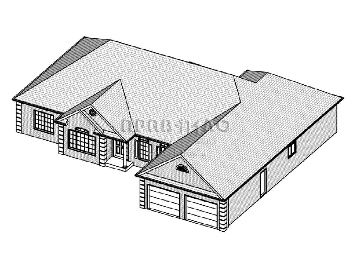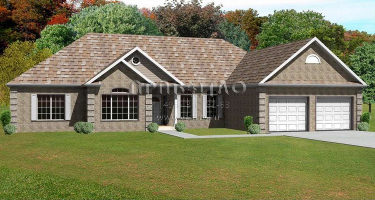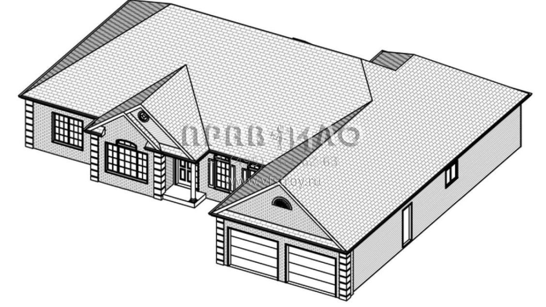 Это проект одноэтажного дома с гаражом на две машины жилой площадью 207 кв.м. Длина дома 17.1 м, ширина 20.7 м, высота 7 м. В доме три спальни и два санузла.