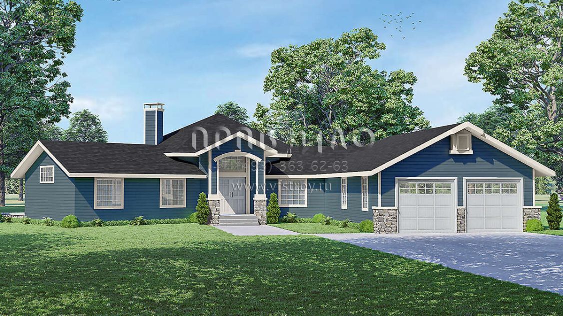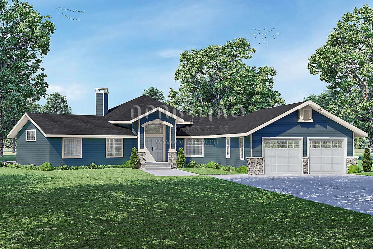 Это проект одноэтажного дома с гаражом на две машины жилой площадью 208 кв.м. Длина дома 22.9 м, ширина 24.7 м, высота 7 м. В доме две спальни и два санузла.