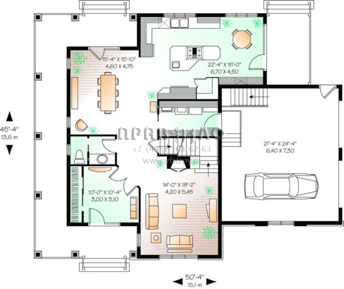 S5-209 (034-00827) Это иностранный проект, для которого требуется адаптация под нормы, действующие в Российской Федерации. Вы видите проект дома в стиле Ранчо. В этом доме сочетаются черты сельской постройки и аскетичность лофта. Внутри жильцы смогут проводить время с максимальным комфортом. Обратим внимание, что сейчас на планировках все размеры представлены в футах. Для перевода в метры вам необходимо значение в футах умножить на 0,3048.