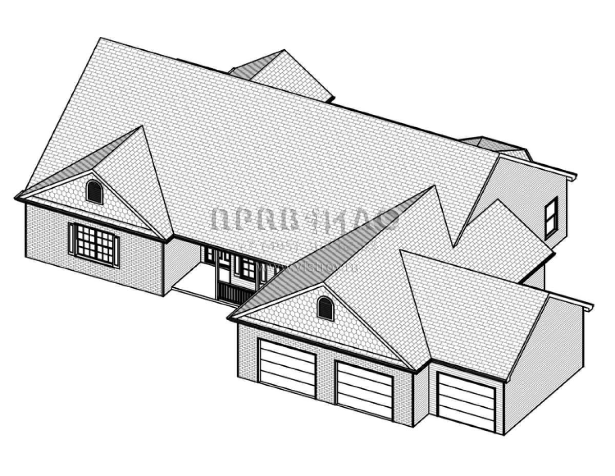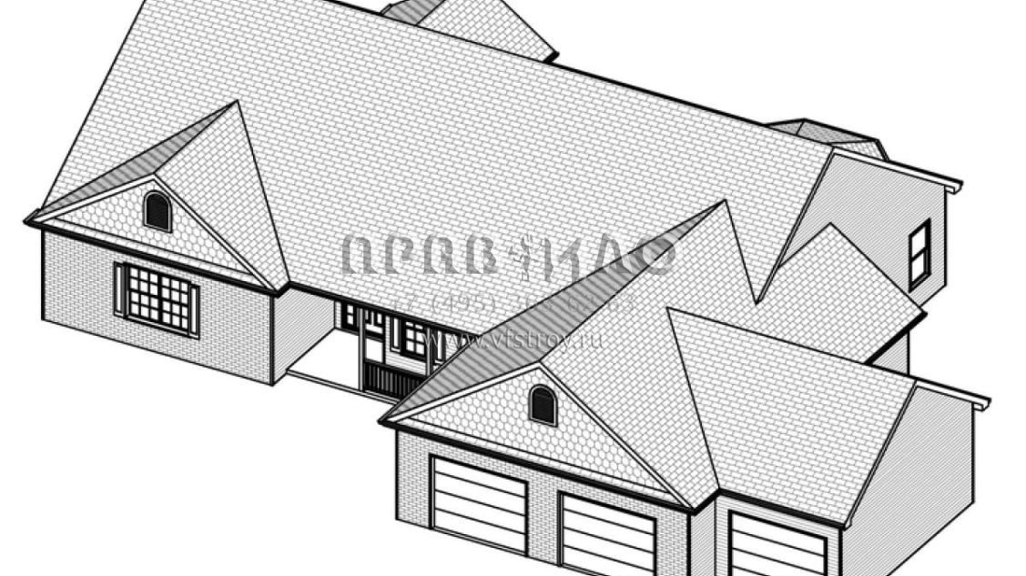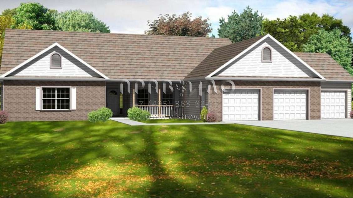 Это проект одноэтажного дома с гаражом на три и более машин жилой площадью 209 кв.м. Длина дома 17.7 м, ширина 25 м, высота 7.3 м. В доме три спальни и два санузла.