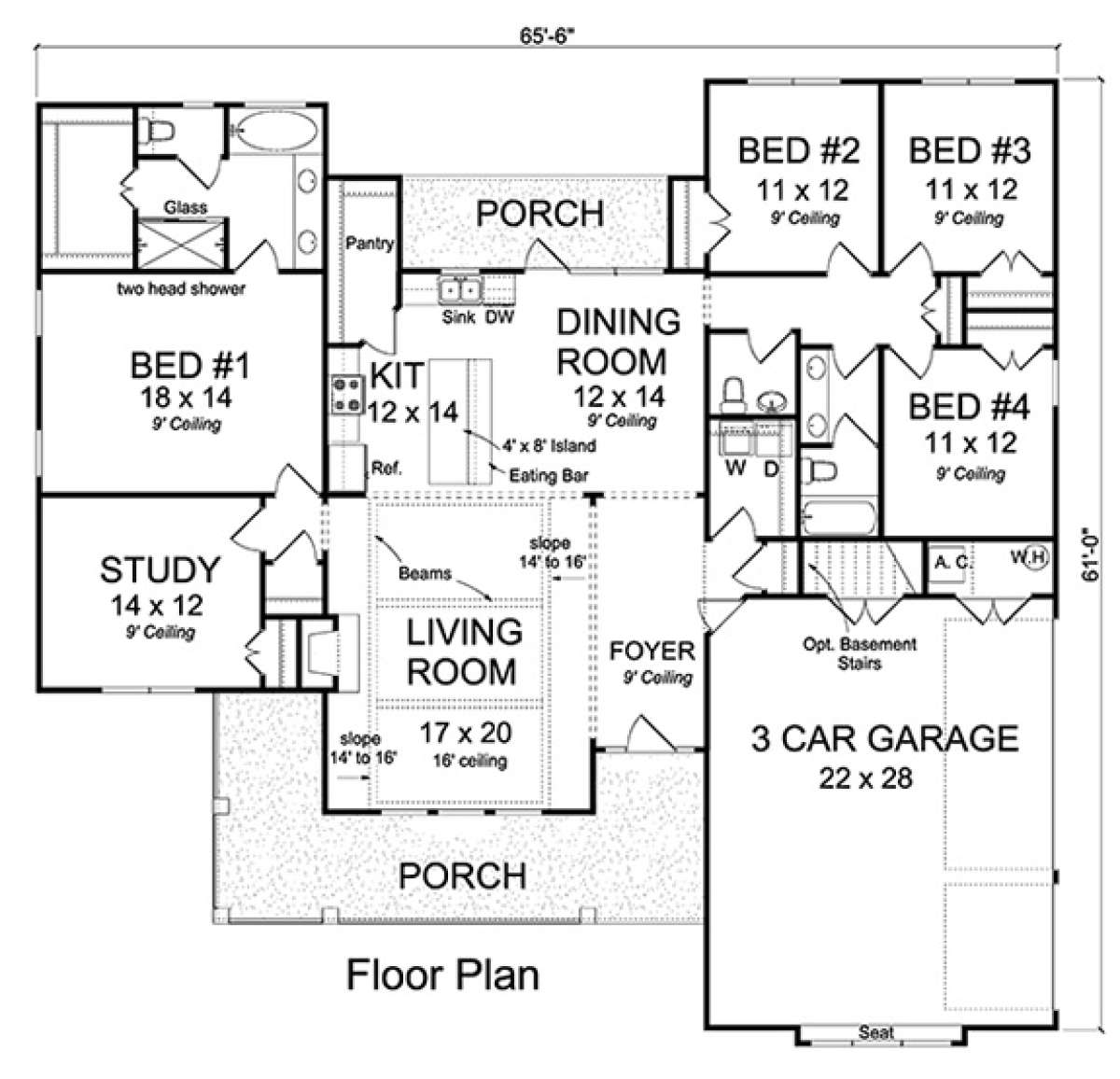 Это проект одноэтажного дома с гаражом на три и более машин жилой площадью 210 кв.м. Длина дома 18.6 м, ширина 19.8 м, высота 7 м. В доме четыре спальни и два санузла.