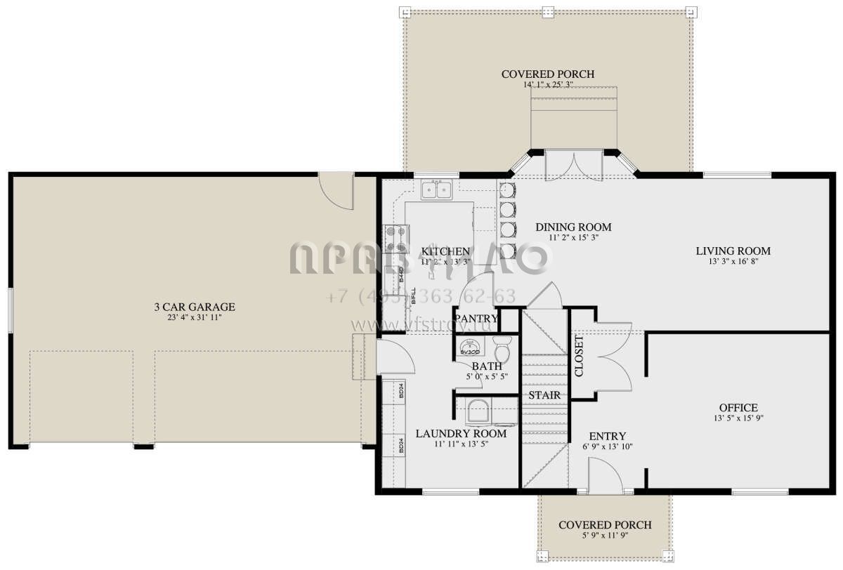 S5-211 (2802-00242) Это иностранный проект, для которого требуется адаптация под нормы, действующие в Российской Федерации. Вы видите проект дома в стиле Ранчо. В этом доме сочетаются черты сельской постройки и аскетичность лофта. Внутри жильцы смогут проводить время с максимальным комфортом. Обратим внимание, что сейчас на планировках все размеры представлены в футах. Для перевода в метры вам необходимо значение в футах умножить на 0,3048.