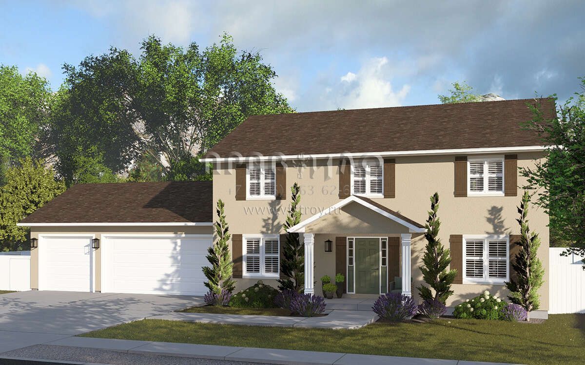 Двухэтажный проект дома позволяет рационально распорядиться площадью участка небольшого размера или узкой формы. На первом этаже находятся общие комнаты (гостиная/столовая, кухня, подсобные и технические помещения), на втором — спальни членов семьи.
