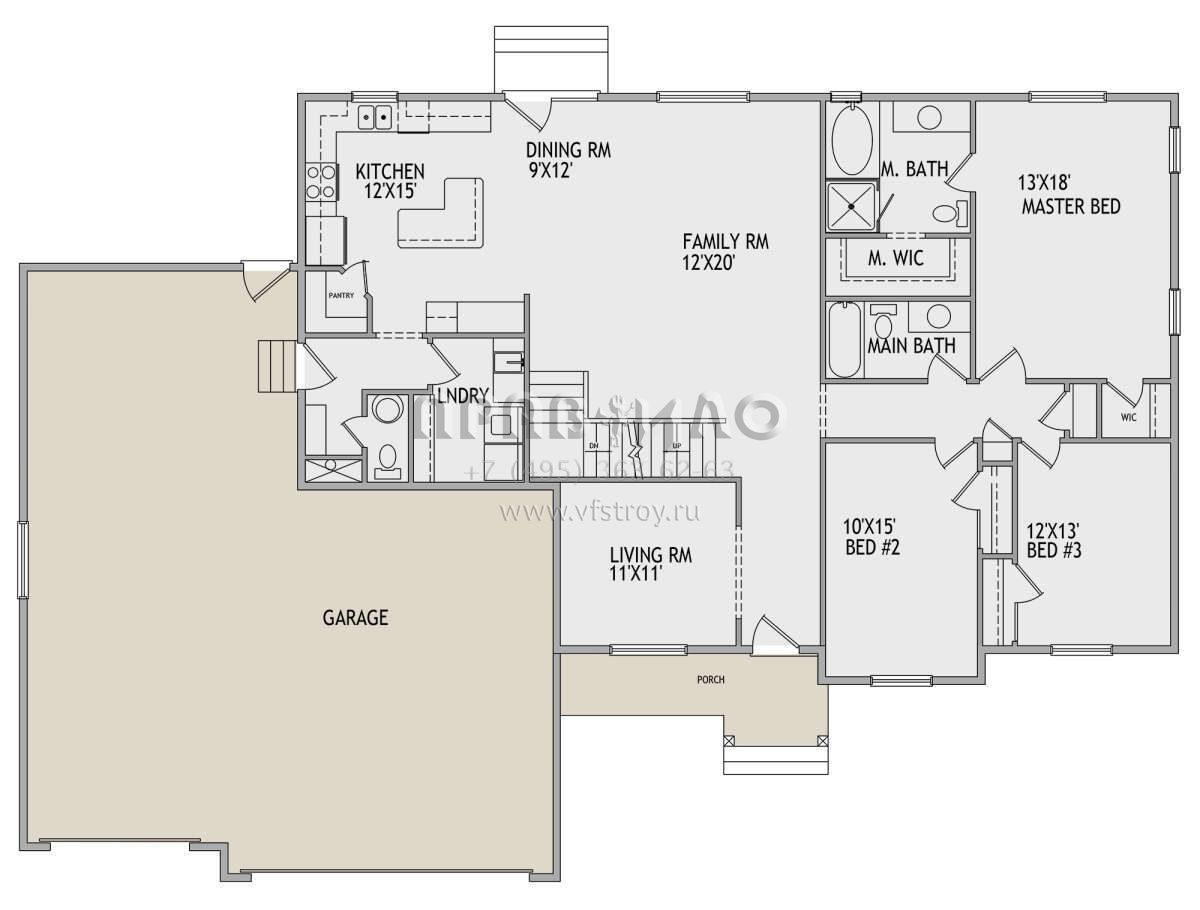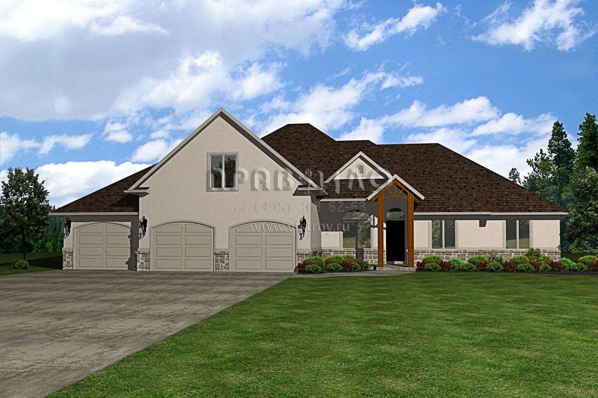 Это проект одноэтажного дома с гаражом на три и более машин жилой площадью 211 кв.м. Длина дома 15.5 м, ширина 22.9 м, высота 8.2 м. В доме три спальни и два санузла.