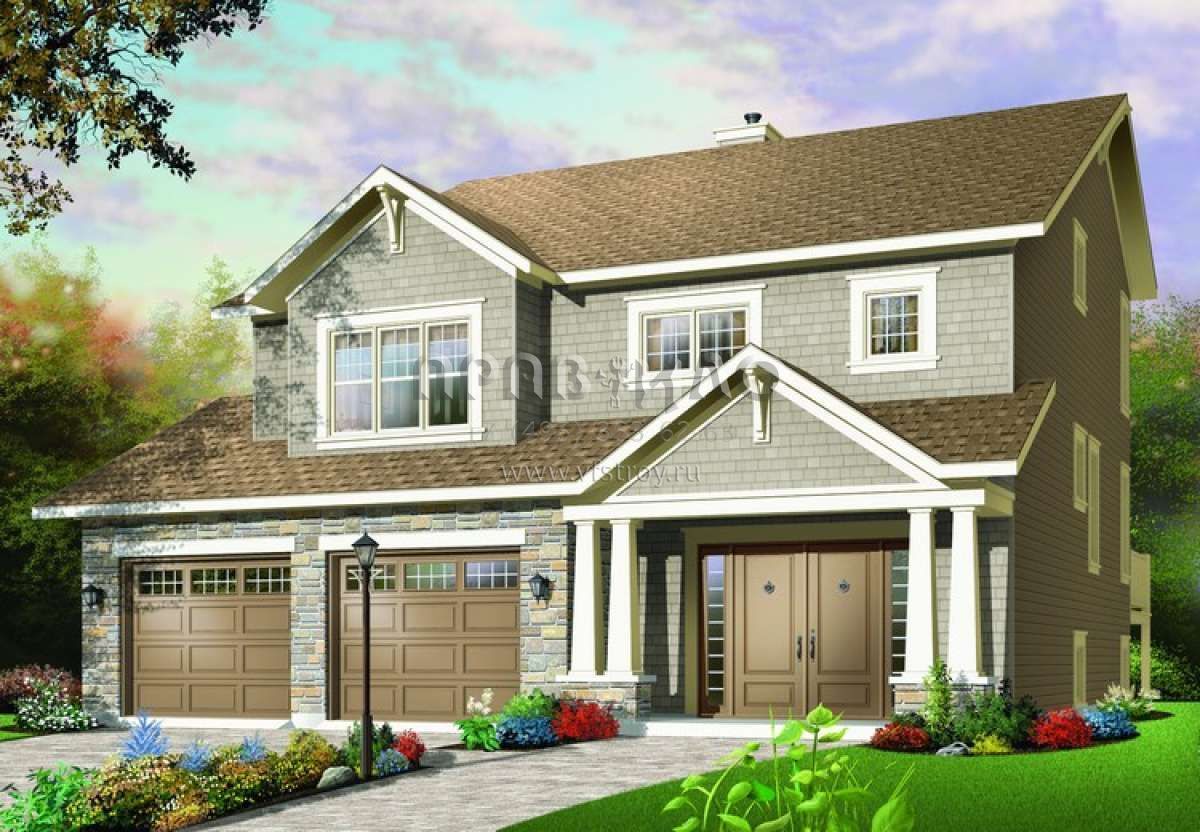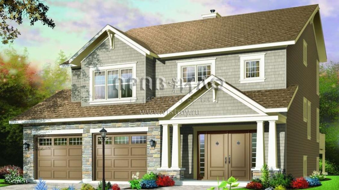Это проект двухэтажного дома с гаражом на две машины жилой площадью 213 кв.м. Длина дома 15.2 м, ширина 11.9 м, высота 8.8 м. В доме три спальни и два санузла.