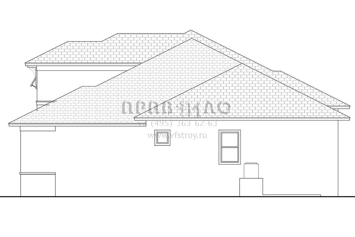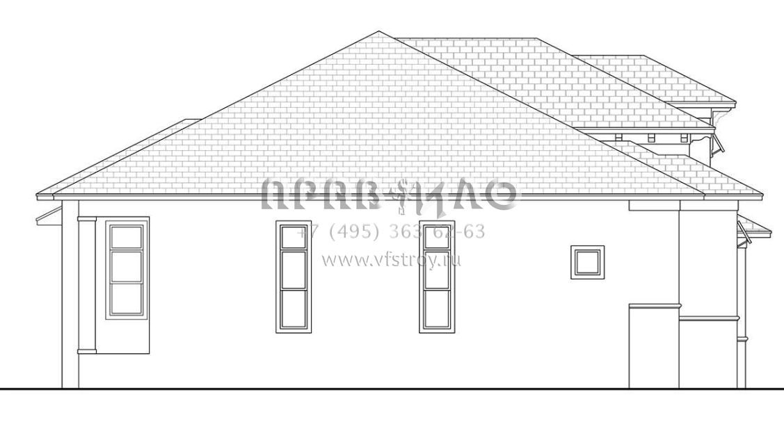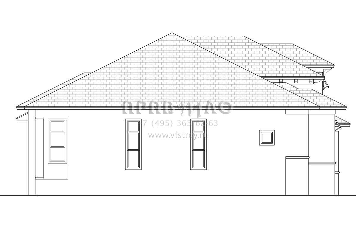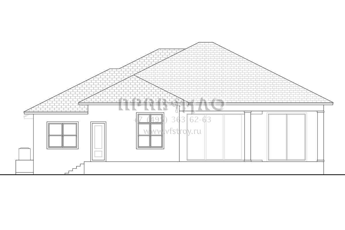 Это проект одноэтажного дома с гаражом на одну машину жилой площадью 214 кв.м. Длина дома 16.5 м, ширина 19.2 м, высота 7.6 м. В доме три спальни и три санузла.