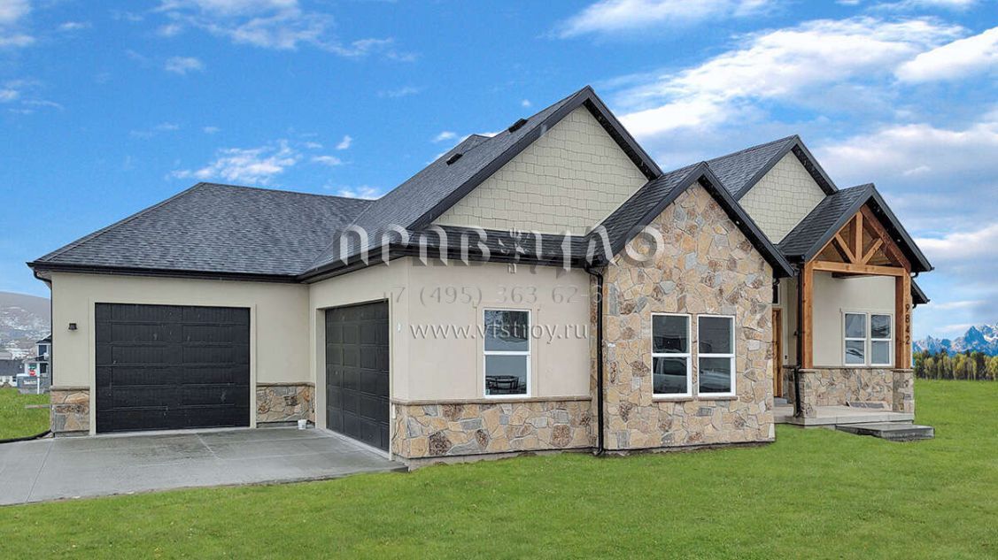 Это проект одноэтажного дома с гаражом на три и более машин жилой площадью 214 кв.м. Длина дома 23.2 м, ширина 21.9 м, высота 7.6 м. В доме две спальни и два санузла.