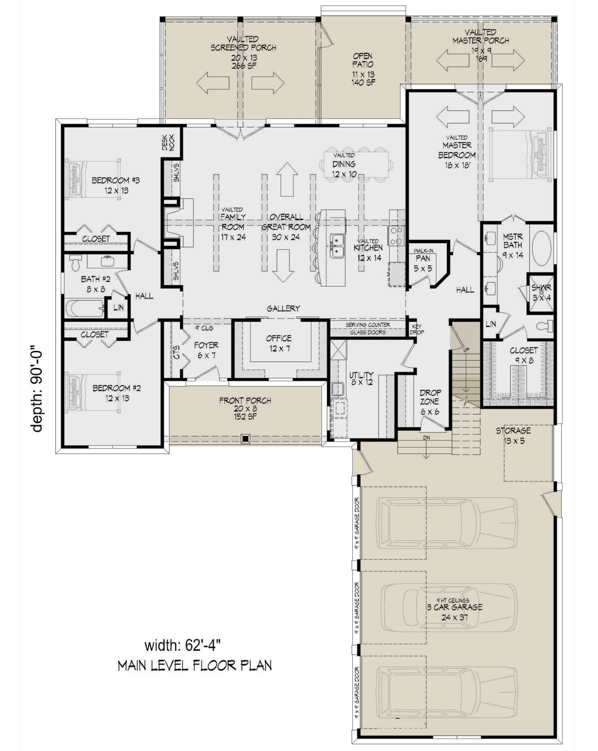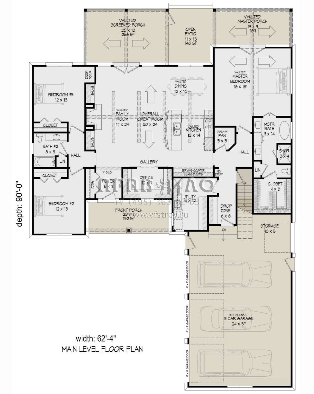 Это проект одноэтажного дома с гаражом на три и более машин жилой площадью 214 кв.м. Длина дома 27.4 м, ширина 18.9 м, высота 8.2 м. В доме три спальни и два санузла.