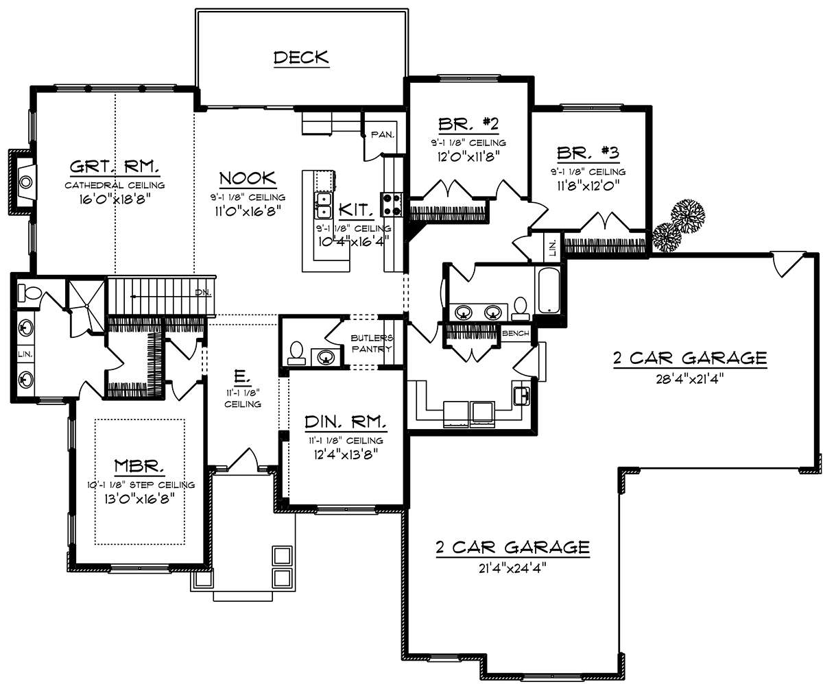 Это проект одноэтажного дома с гаражом на три и более машин жилой площадью 216 кв.м. Длина дома 18.6 м, ширина 25 м, высота 7.6 м. В доме три спальни и два санузла.