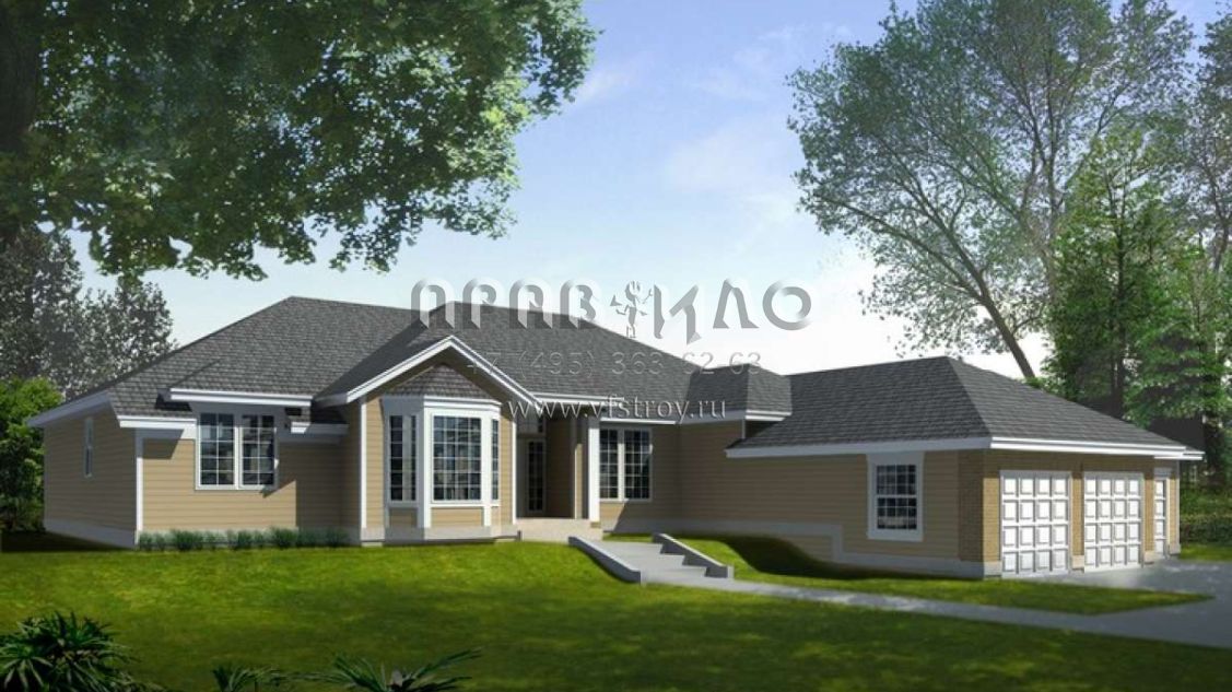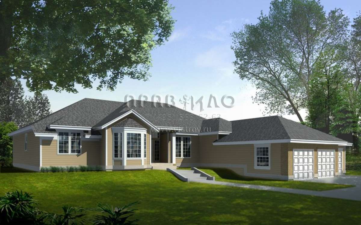 Это проект одноэтажного дома с гаражом на три и более машин жилой площадью 216 кв.м. Длина дома 20.1 м, ширина 23.8 м, высота 7 м. В доме три спальни и два санузла.