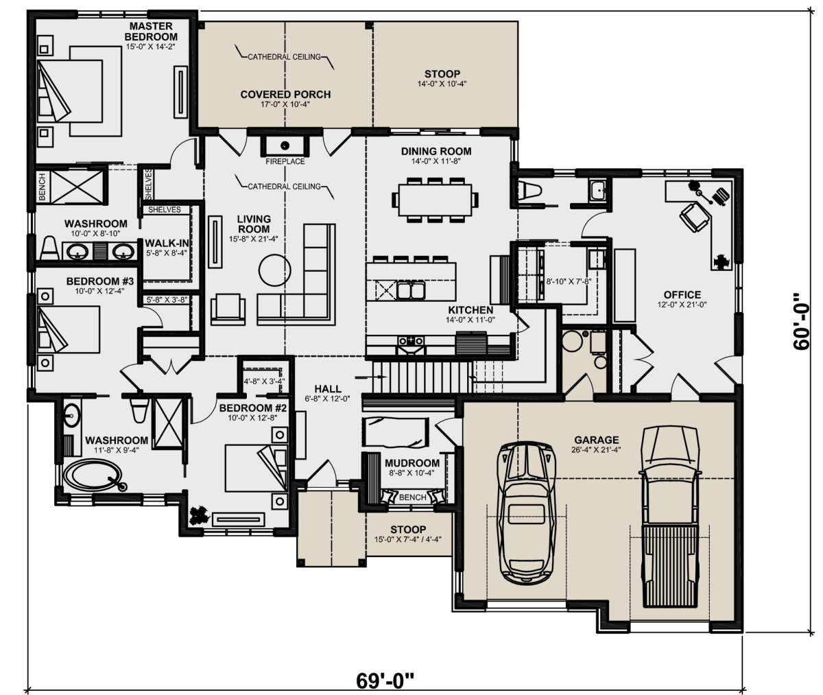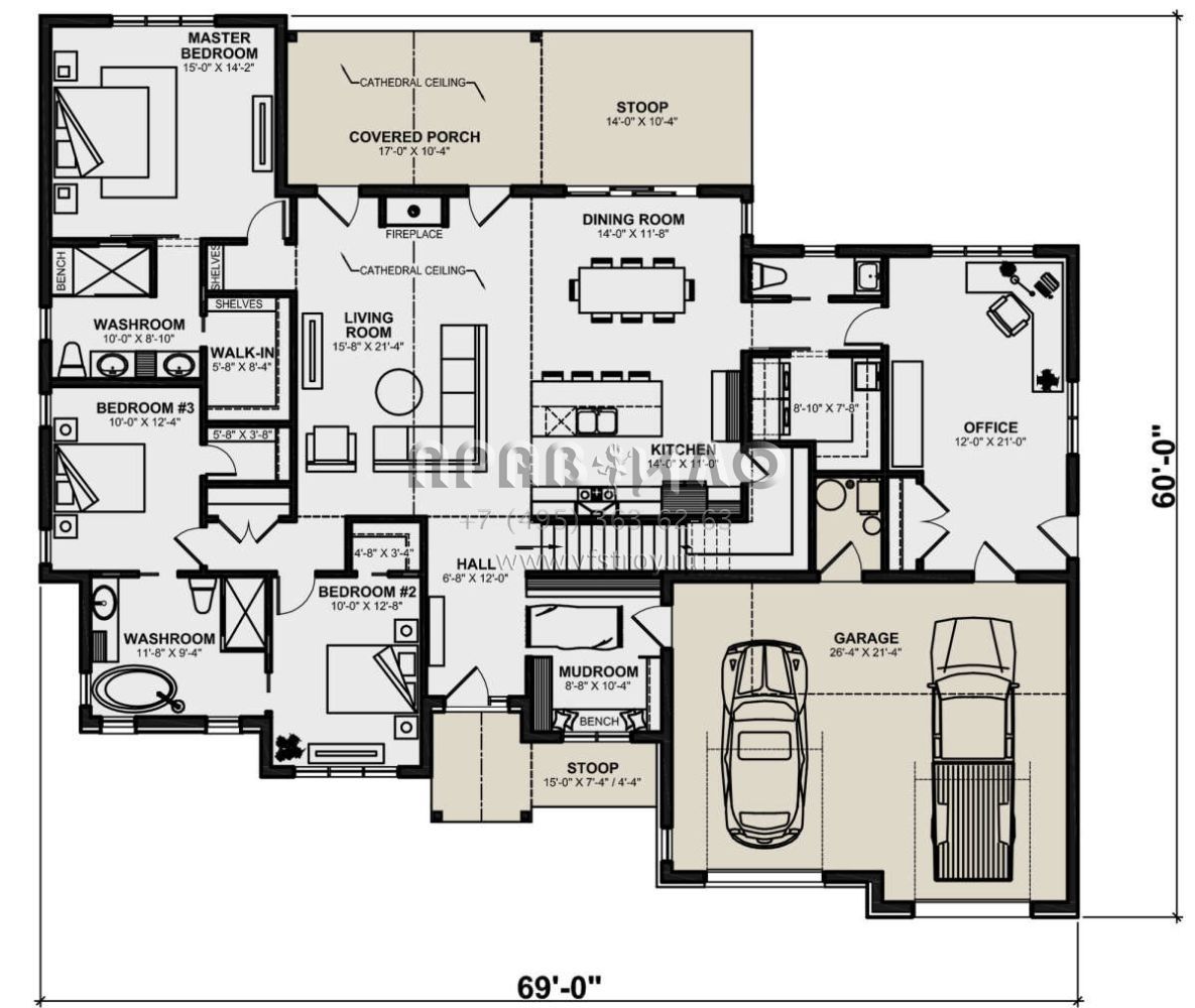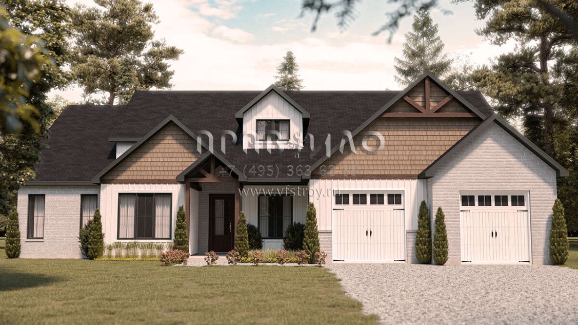 Это проект одноэтажного дома с гаражом на две машины жилой площадью 217 кв.м. Длина дома 18.3 м, ширина 21 м, высота 7.6 м. В доме три спальни и два санузла.