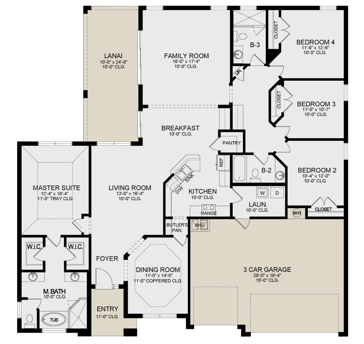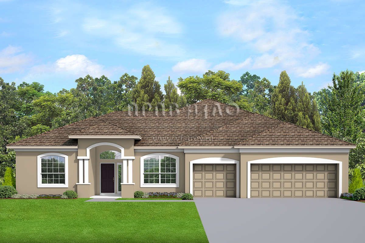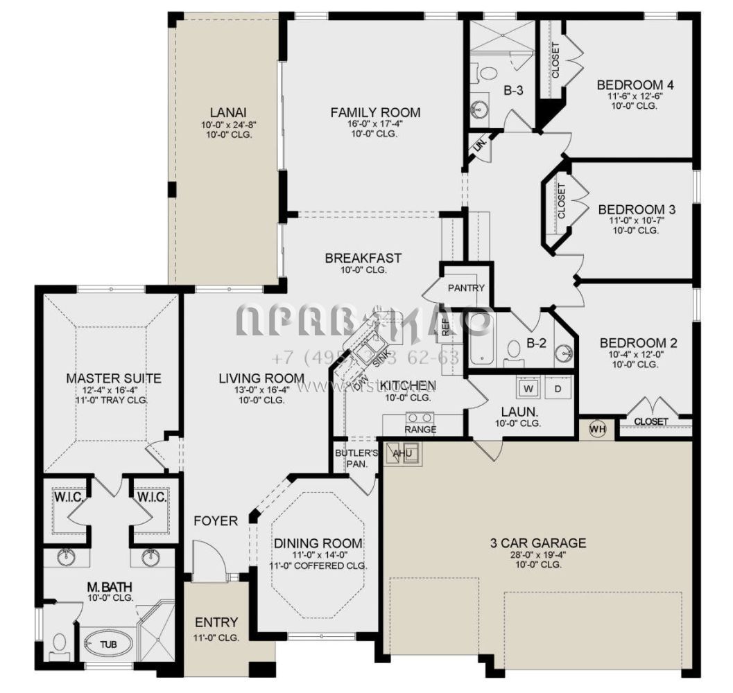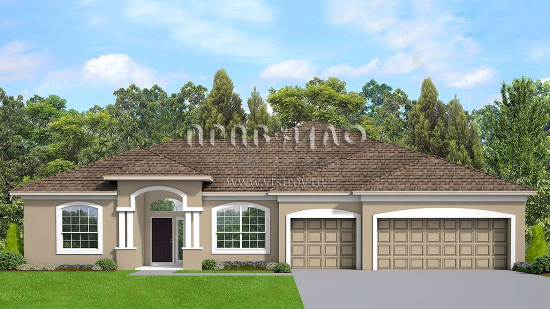 Это проект одноэтажного дома с гаражом на три и более машин жилой площадью 217 кв.м. Длина дома 18.3 м, ширина 18.3 м, высота 7 м. В доме четыре спальни и три санузла.