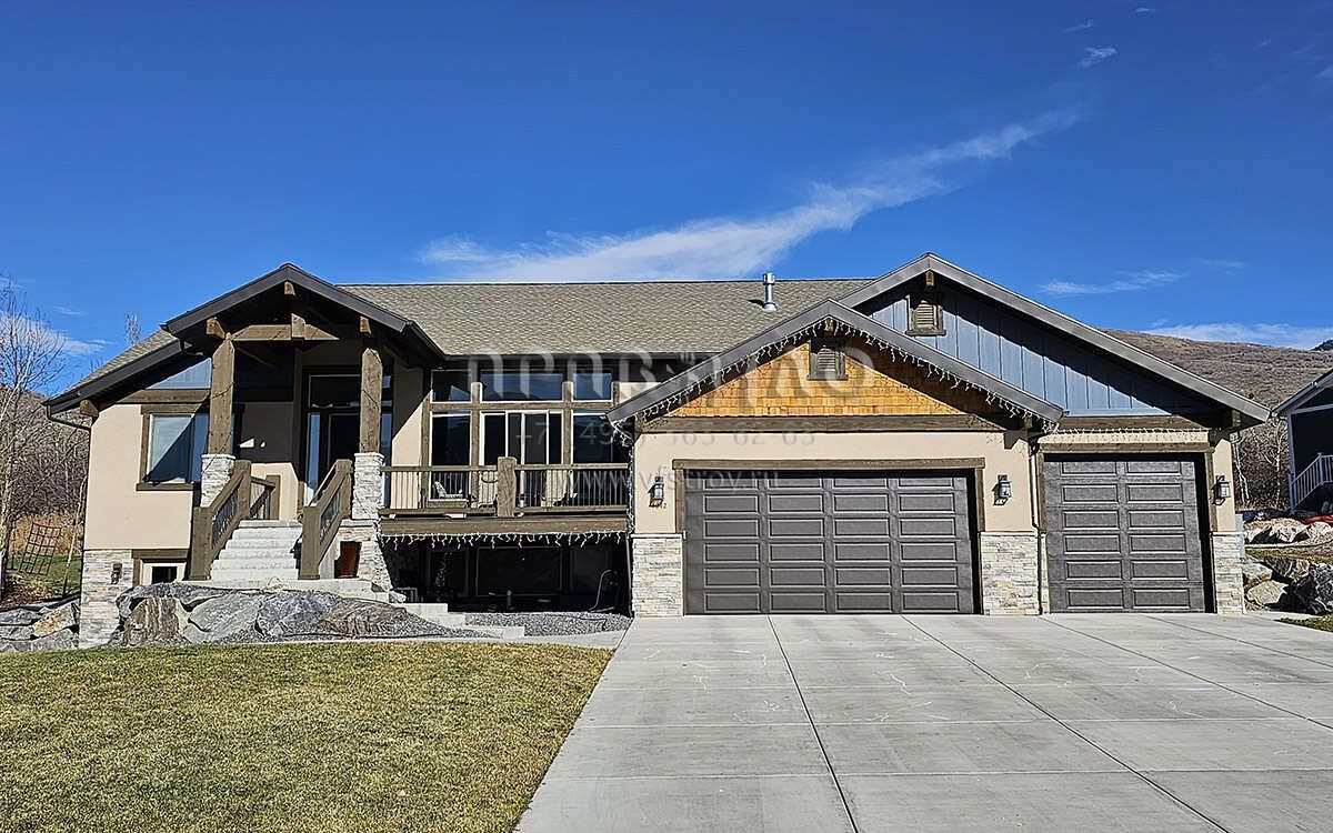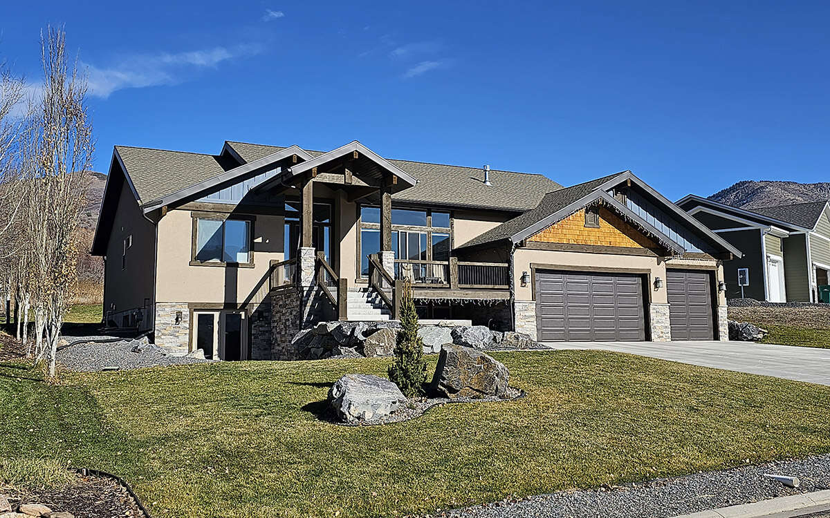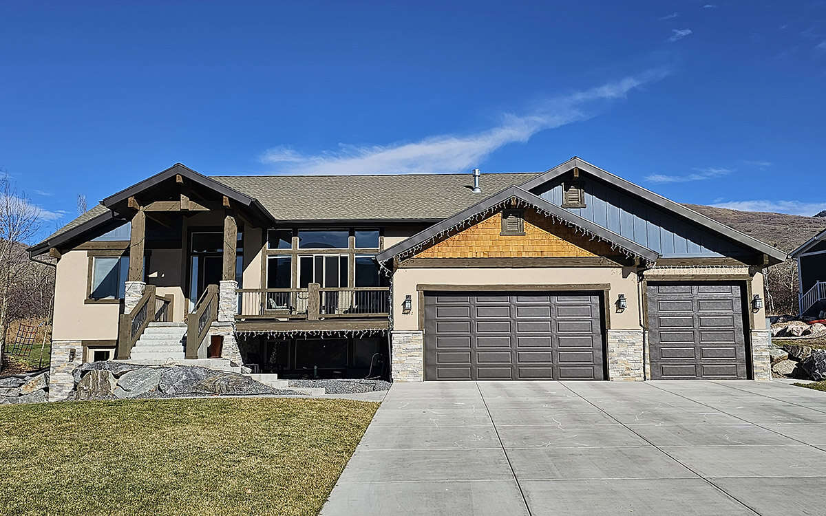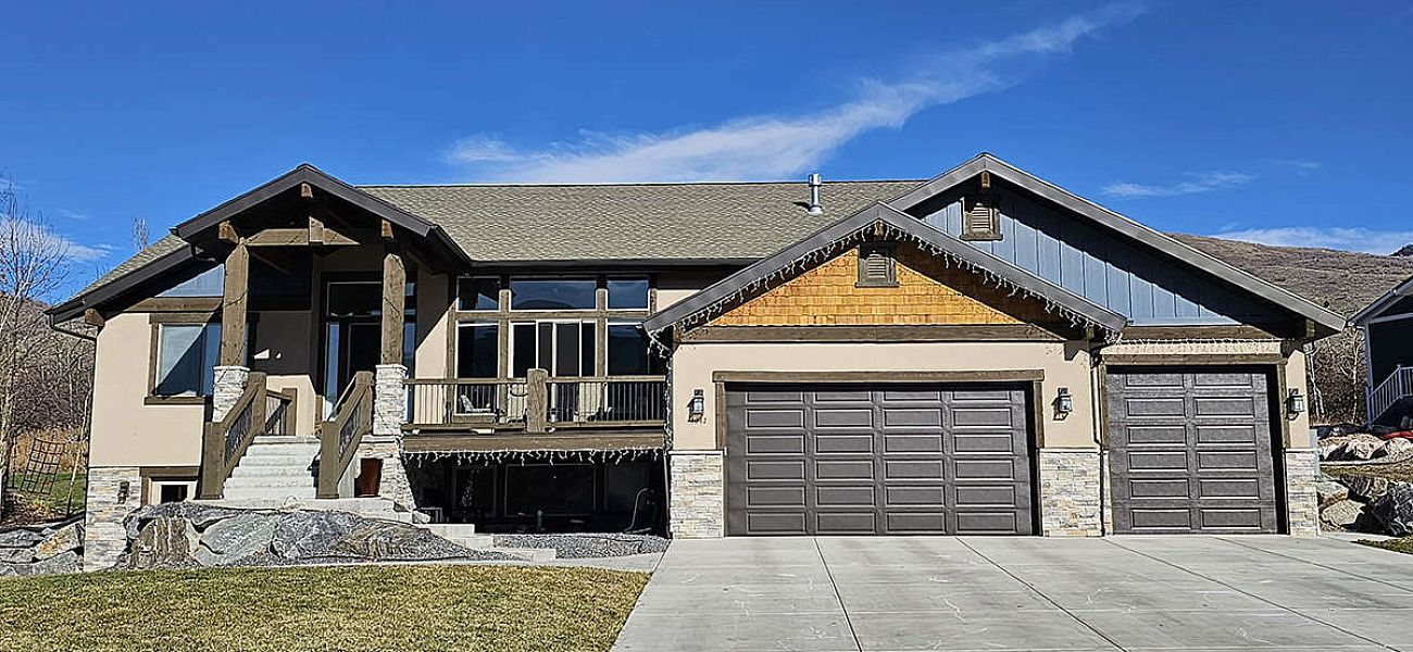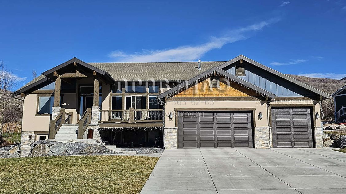 Это проект одноэтажного дома с гаражом на три и более машин жилой площадью 217 кв.м. Длина дома 18.6 м, ширина 23.2 м, высота 9.4 м. В доме три спальни и два санузла.