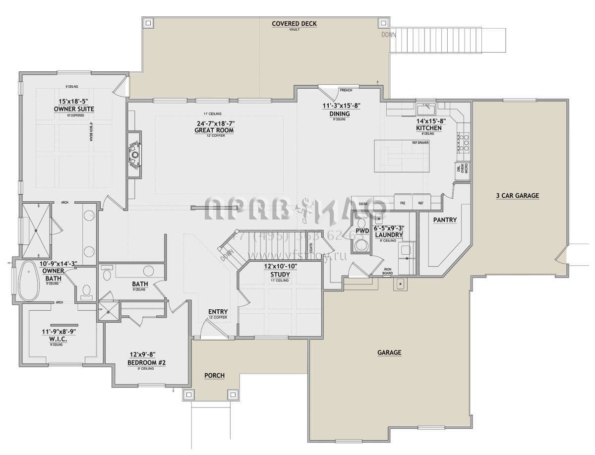 S5-218 (8768-00086) Это иностранный проект, для которого требуется адаптация под нормы, действующие в Российской Федерации. Вы видите проект дома в стиле Ранчо. В этом доме сочетаются черты сельской постройки и аскетичность лофта. Внутри жильцы смогут проводить время с максимальным комфортом. Обратим внимание, что сейчас на планировках все размеры представлены в футах. Для перевода в метры вам необходимо значение в футах умножить на 0,3048.