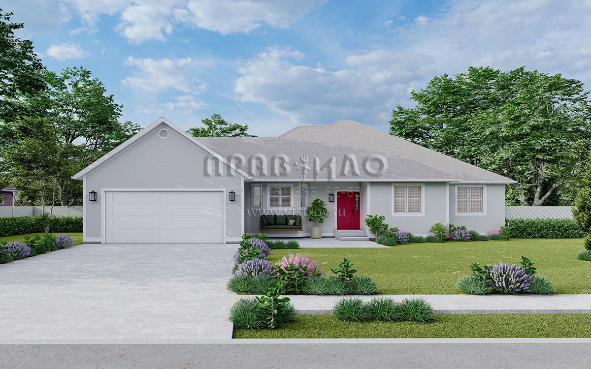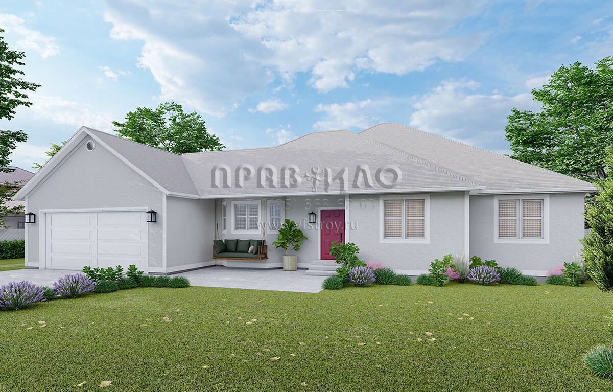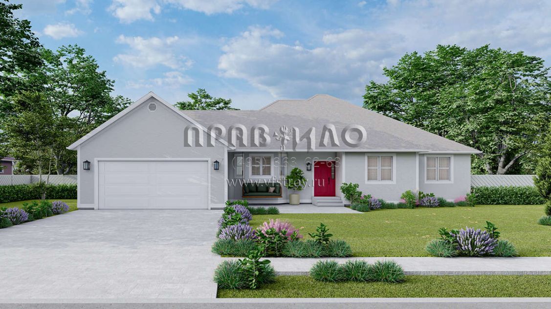 Это проект одноэтажного дома с гаражом на две машины жилой площадью 219 кв.м. Длина дома 17.1 м, ширина 21.3 м, высота 7.6 м. В доме четыре спальни и два санузла.