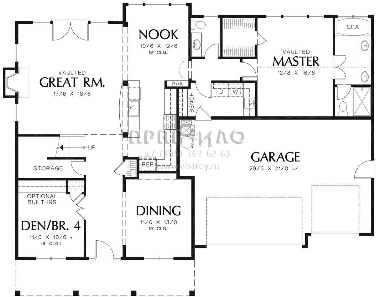S5-220 (2559-00346) Это иностранный проект, для которого требуется адаптация под нормы, действующие в Российской Федерации. Вы видите проект дома в стиле Ранчо. В этом доме сочетаются черты сельской постройки и аскетичность лофта. Внутри жильцы смогут проводить время с максимальным комфортом. Обратим внимание, что сейчас на планировках все размеры представлены в футах. Для перевода в метры вам необходимо значение в футах умножить на 0,3048.