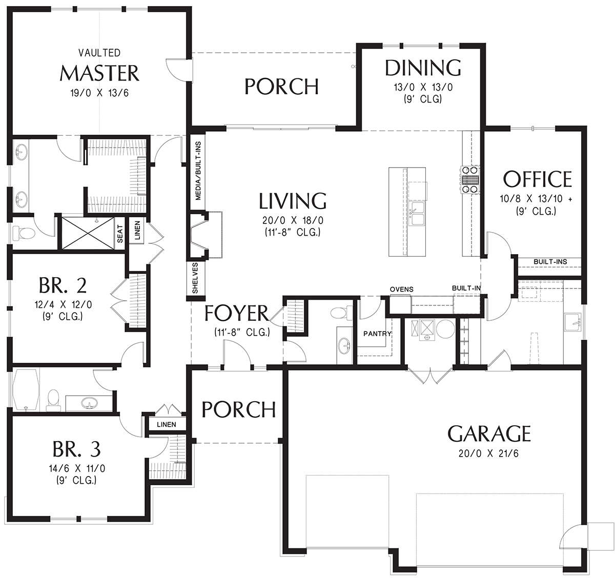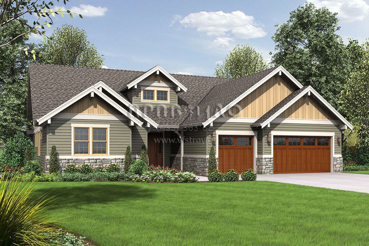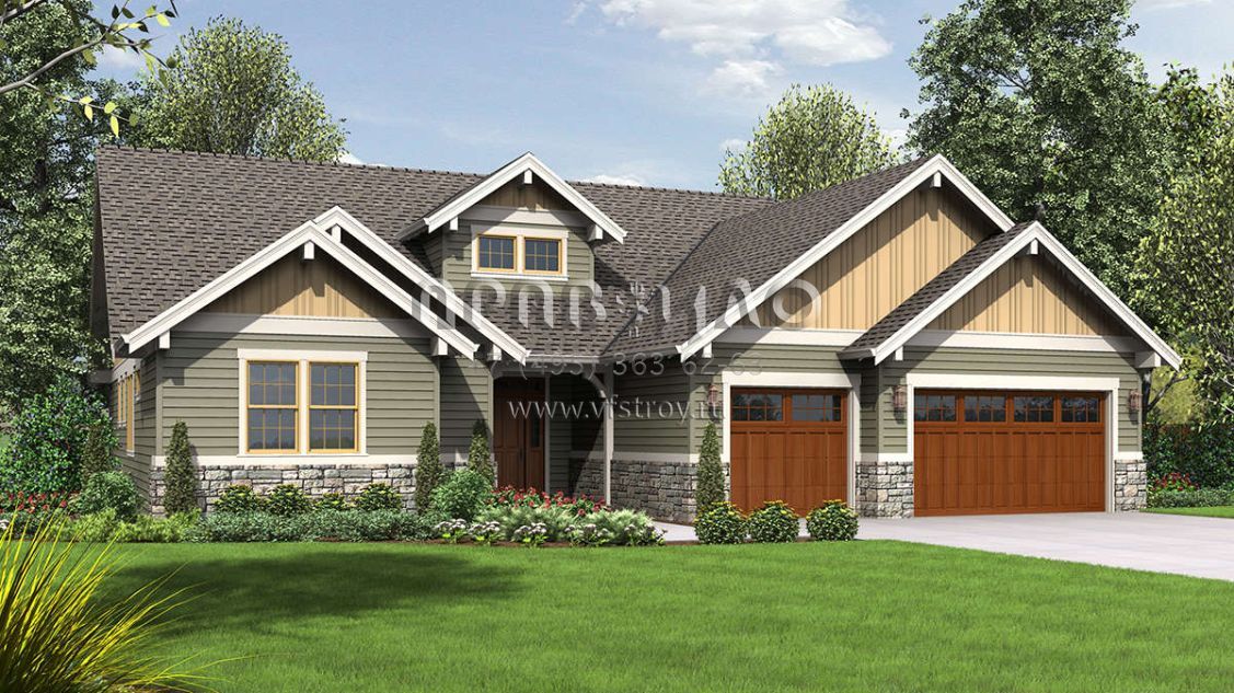 Это проект одноэтажного дома с гаражом на три и более машин жилой площадью 220 кв.м. Длина дома 18.6 м, ширина 19.2 м, высота 7.3 м. В доме три спальни и два санузла.