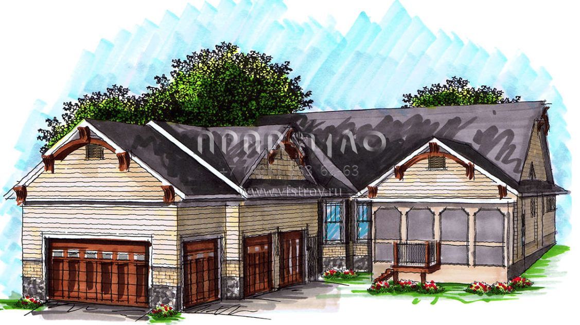 Это проект одноэтажного дома с гаражом на три и более машин жилой площадью 222 кв.м. Длина дома 28.7 м, ширина 16.8 м, высота 7.6 м. В доме две спальни и два санузла.