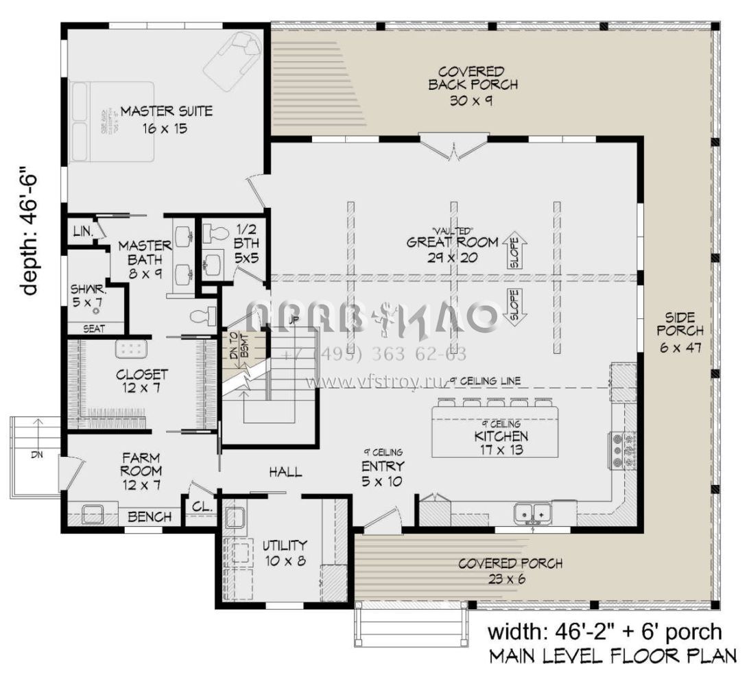 S5-223 (940-00821) Это иностранный проект, для которого требуется адаптация под нормы, действующие в Российской Федерации. Вы видите проект дома в стиле Ранчо. В этом доме сочетаются черты сельской постройки и аскетичность лофта. Внутри жильцы смогут проводить время с максимальным комфортом. Обратим внимание, что сейчас на планировках все размеры представлены в футах. Для перевода в метры вам необходимо значение в футах умножить на 0,3048.