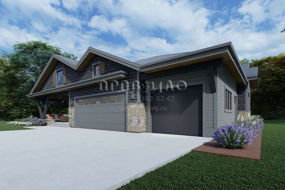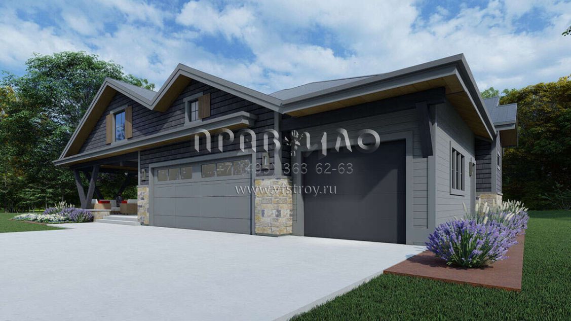Это проект одноэтажного дома с гаражом на три и более машин жилой площадью 224 кв.м. Длина дома 20.1 м, ширина 21.3 м, высота 7.3 м. В доме три спальни и два санузла.
