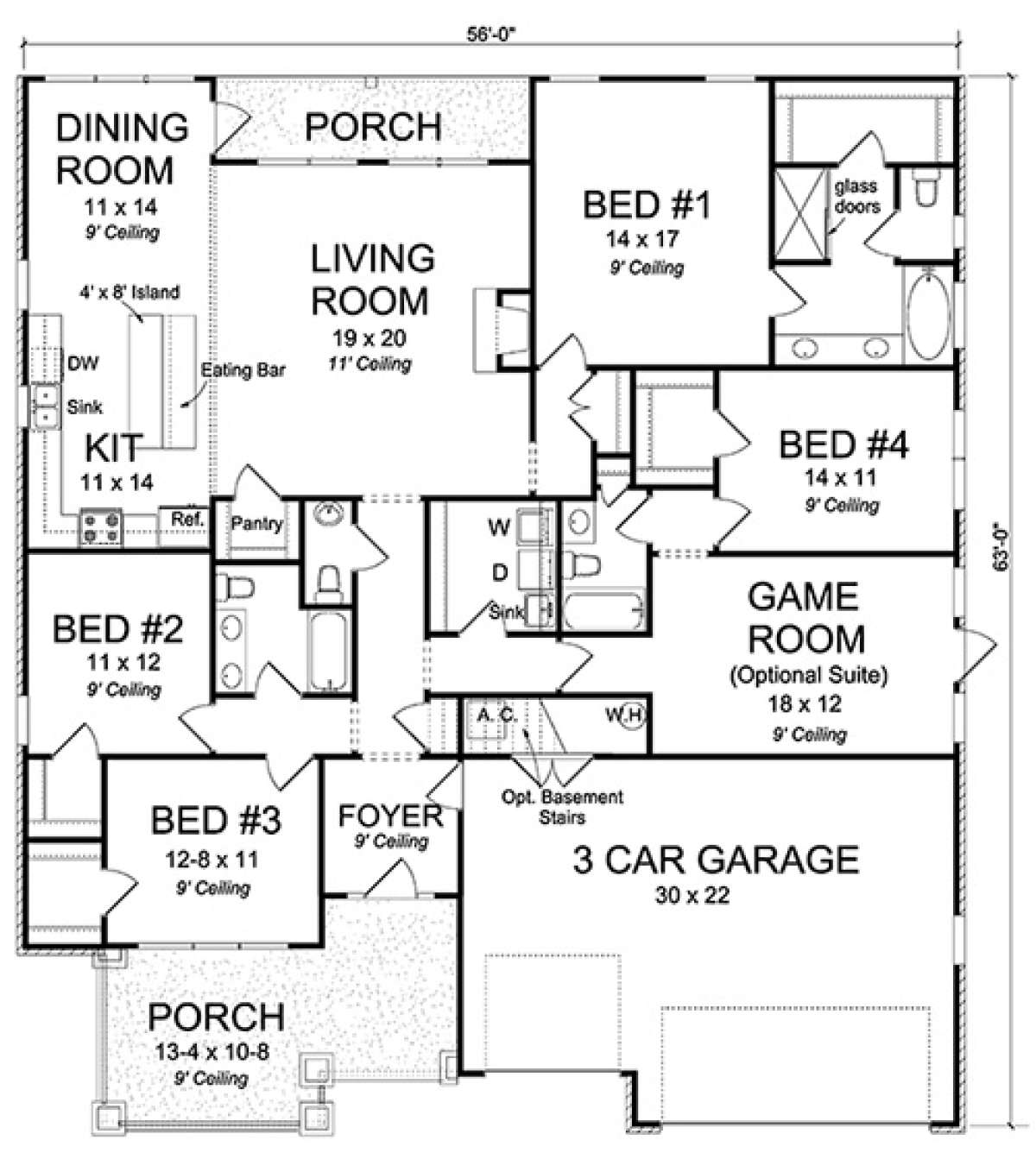 Это проект одноэтажного дома с гаражом на три и более машин жилой площадью 225 кв.м. Длина дома 19.2 м, ширина 17.1 м, высота 8.5 м. В доме четыре спальни и три санузла.