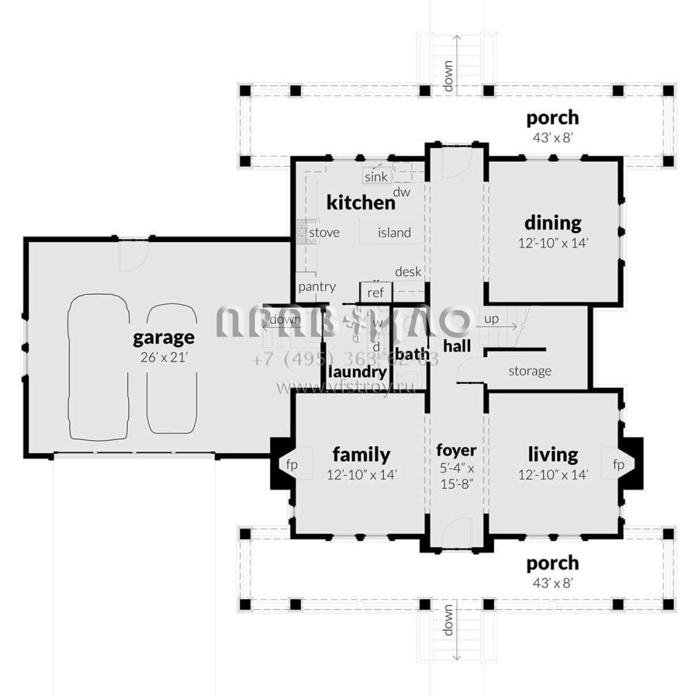 S5-226 (028-00160) Это иностранный проект, для которого требуется адаптация под нормы, действующие в Российской Федерации. Вы видите проект дома в стиле Ранчо. В этом доме сочетаются черты сельской постройки и аскетичность лофта. Внутри жильцы смогут проводить время с максимальным комфортом. Обратим внимание, что сейчас на планировках все размеры представлены в футах. Для перевода в метры вам необходимо значение в футах умножить на 0,3048.