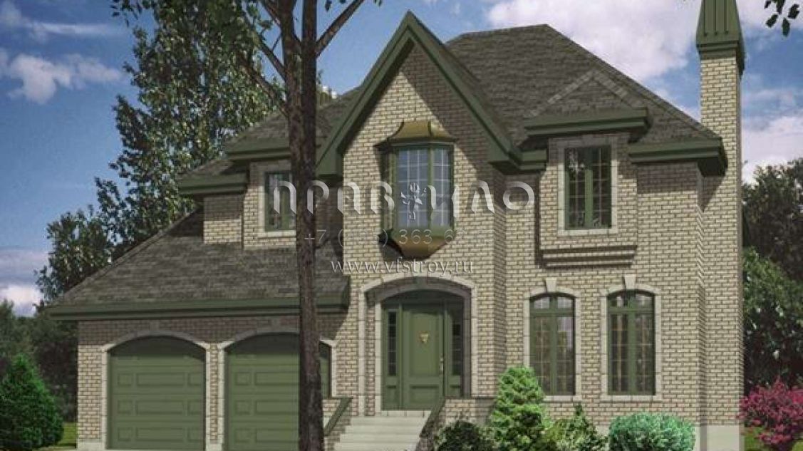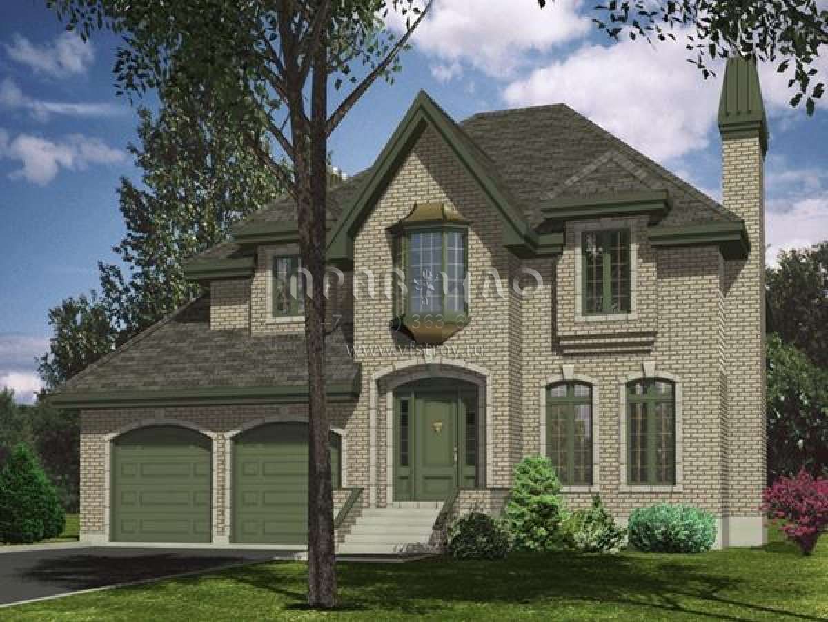 Это проект двухэтажного дома с гаражом на две машины жилой площадью 226 кв.м. Длина дома 12.5 м, ширина 12.8 м, высота 9.4 м. В доме четыре спальни и два санузла.