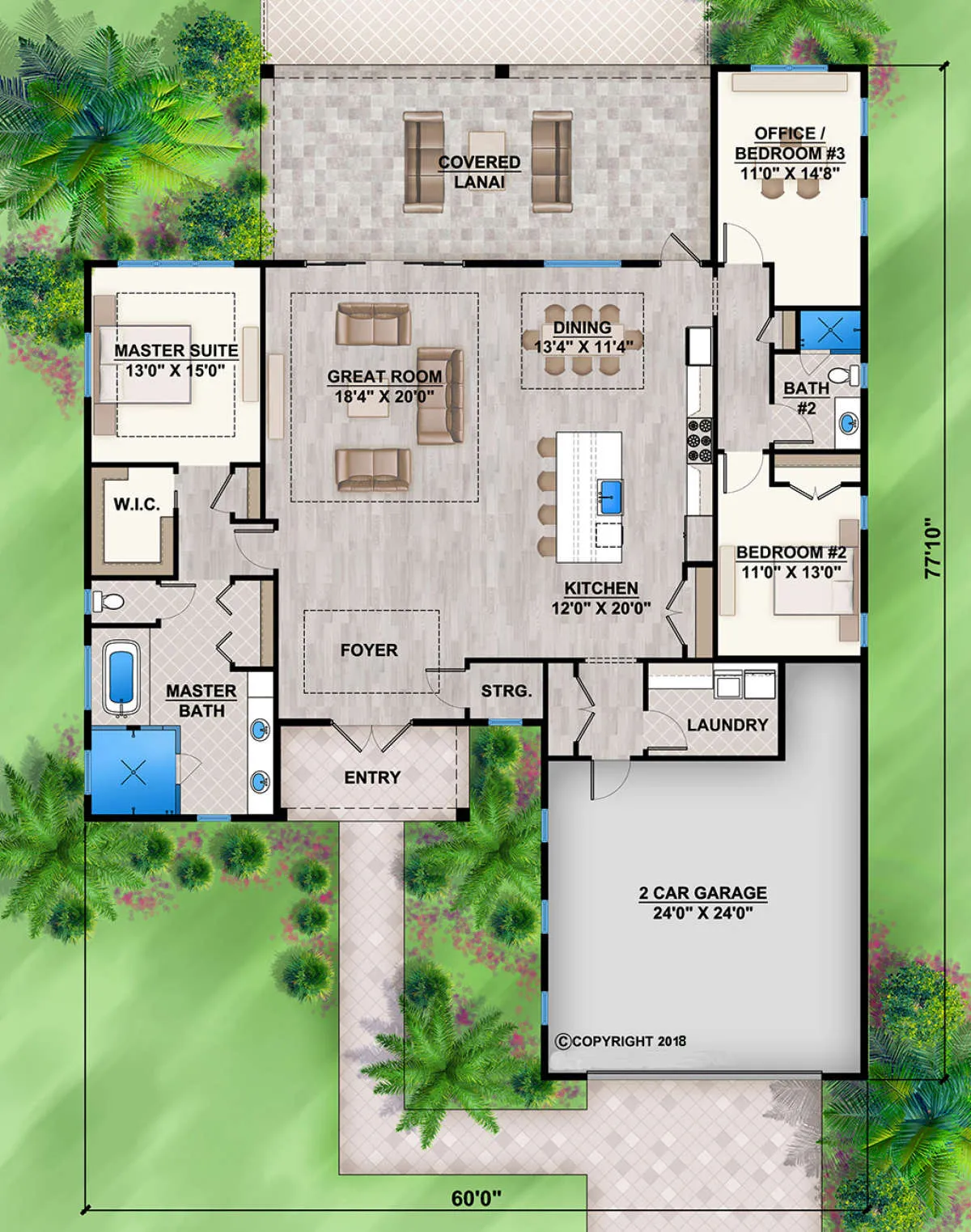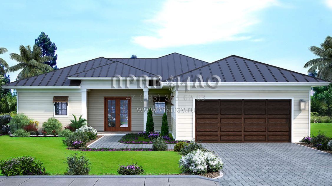 Это проект одноэтажного дома с гаражом на две машины жилой площадью 228 кв.м. Длина дома 23.5 м, ширина 18.3 м, высота 6.4 м. В доме три спальни и два санузла.