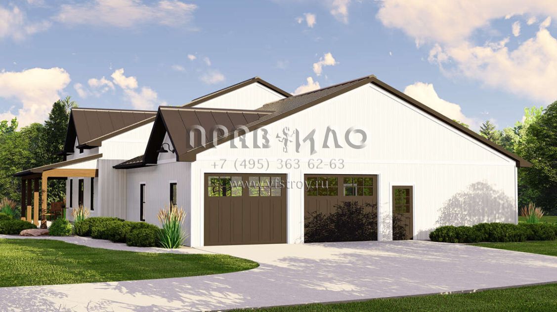 Это проект одноэтажного дома с гаражом на две машины жилой площадью 228 кв.м. Длина дома 20.1 м, ширина 26.8 м, высота 7.3 м. В доме три спальни и два санузла.
