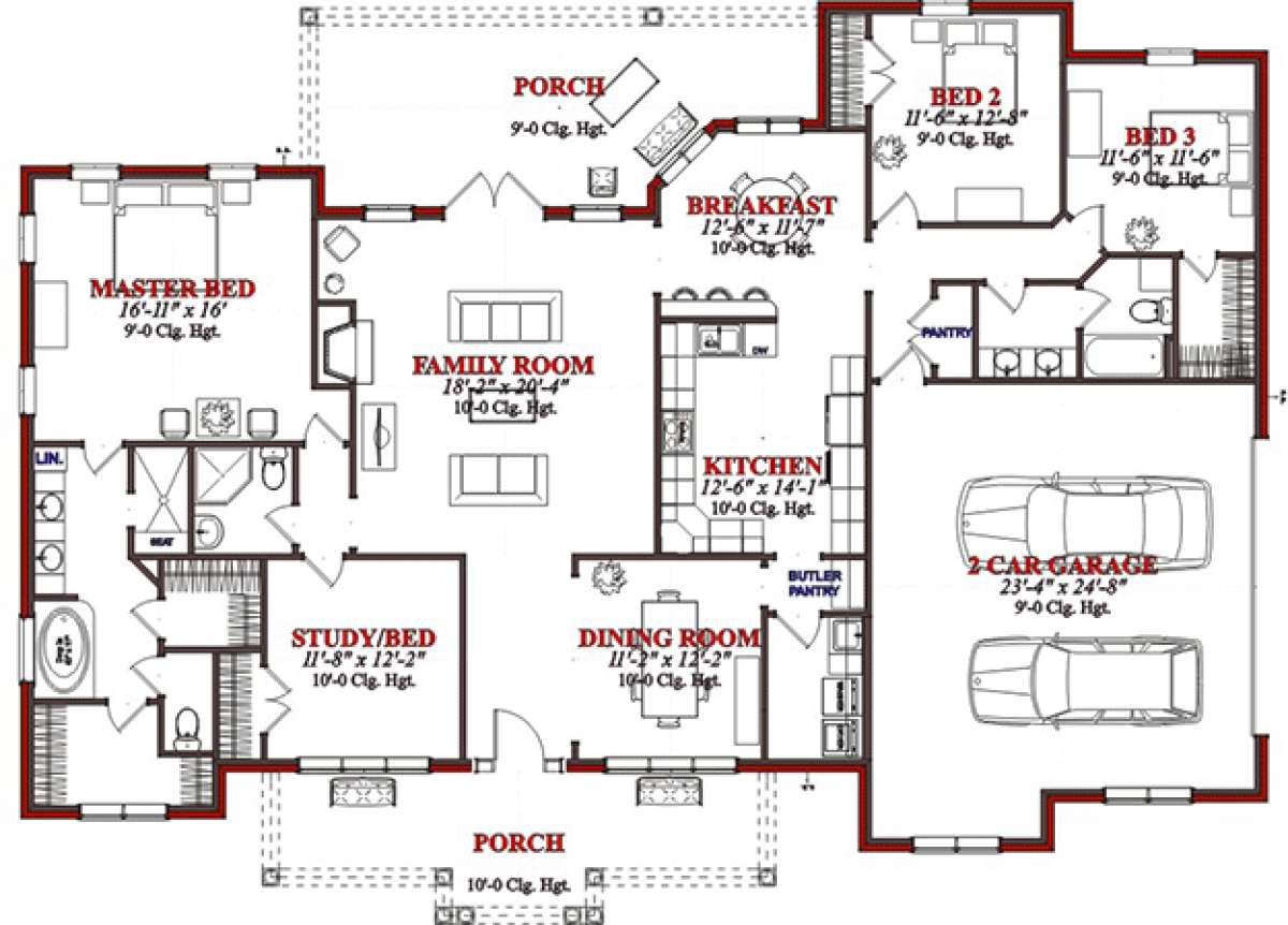 Это проект одноэтажного дома с гаражом на две машины жилой площадью 229 кв.м. Длина дома 17.1 м, ширина 22.9 м, высота 0 м. В доме четыре спальни и три санузла.