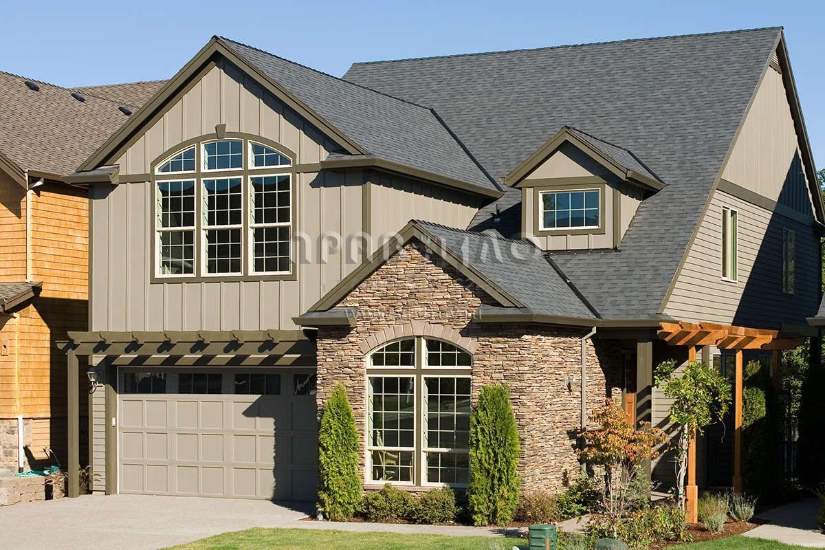 Это проект двухэтажного дома с гаражом на три и более машин жилой площадью 229 кв.м. Длина дома 19.2 м, ширина 10.7 м, высота 9.4 м. В доме три спальни и два санузла.