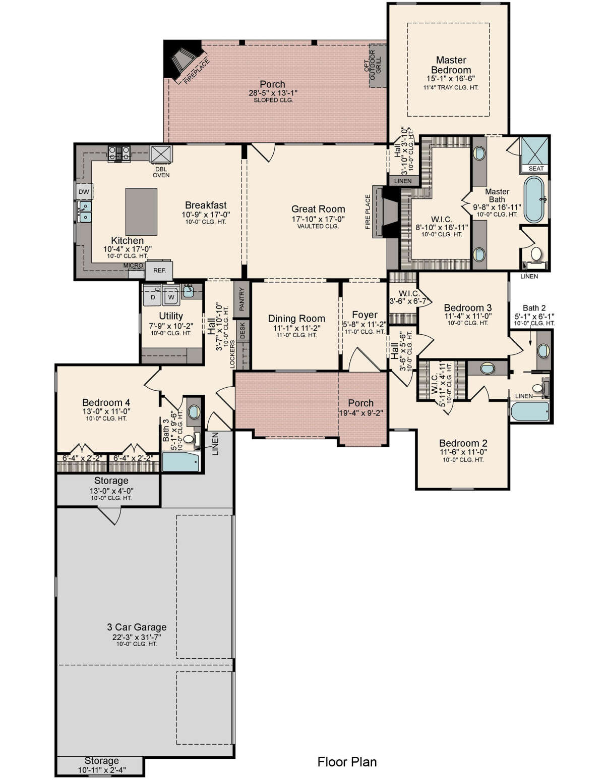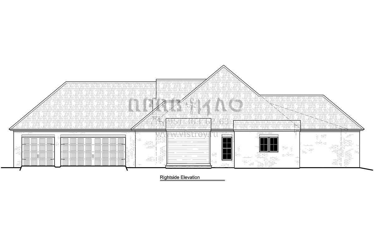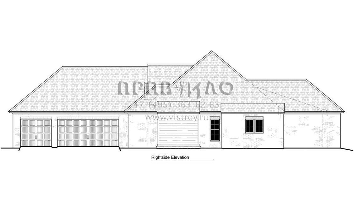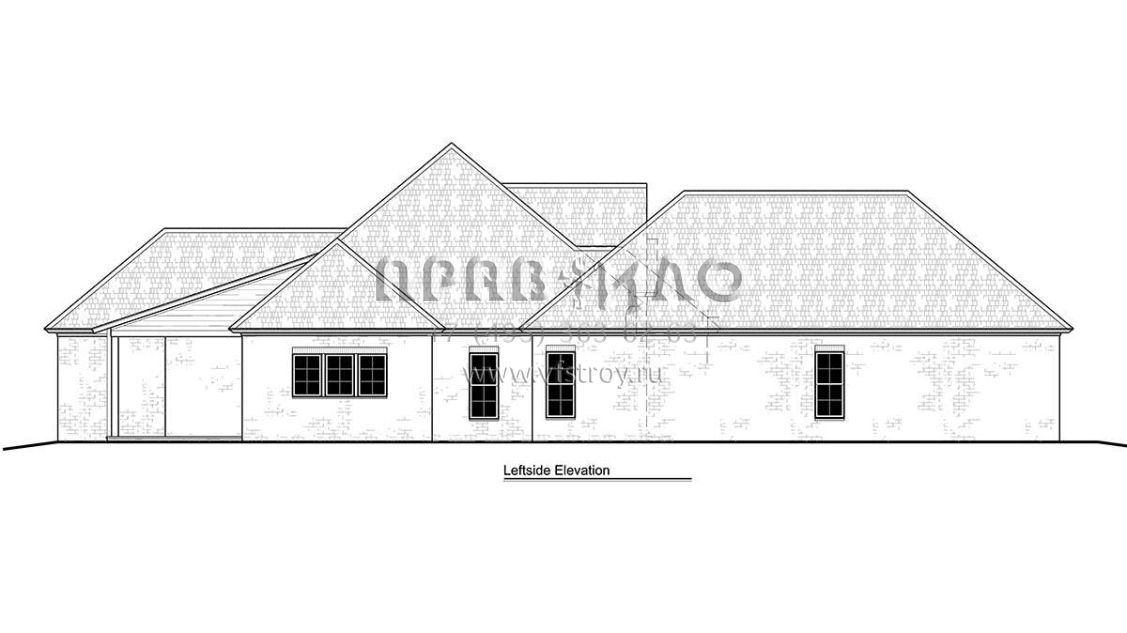 Это проект одноэтажного дома с гаражом на три и более машин жилой площадью 229 кв.м. Длина дома 30.2 м, ширина 19.5 м, высота 8.5 м. В доме четыре спальни и три санузла.