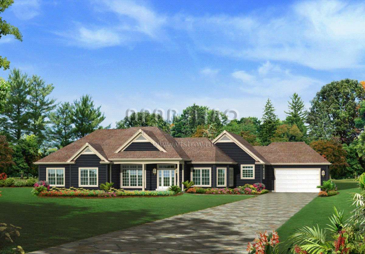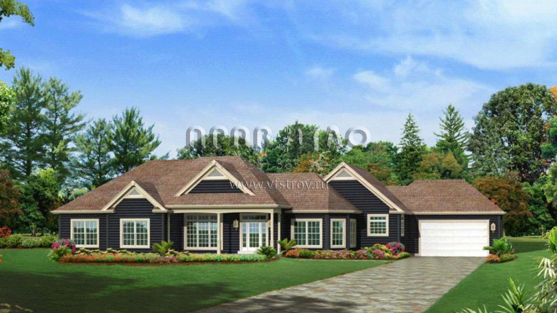 Это проект одноэтажного дома с гаражом на две машины жилой площадью 231 кв.м. Длина дома 19.8 м, ширина 29.3 м, высота 7 м. В доме три спальни и два санузла.