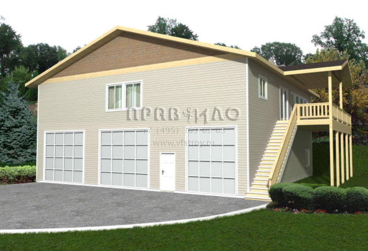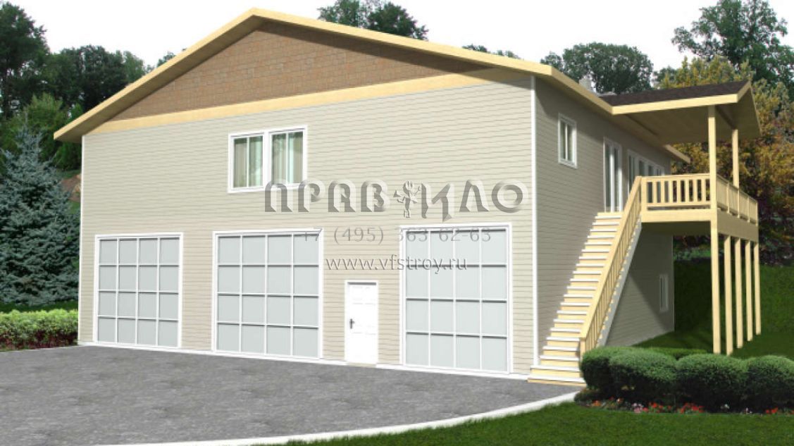 Это проект одноэтажного дома с гаражом на три и более машин жилой площадью 232 кв.м. Длина дома 18 м, ширина 15.2 м, высота 9.1 м. В доме три спальни и два санузла.