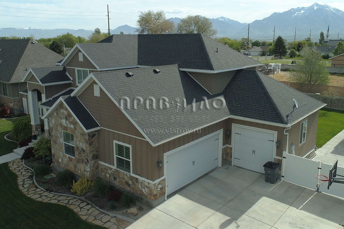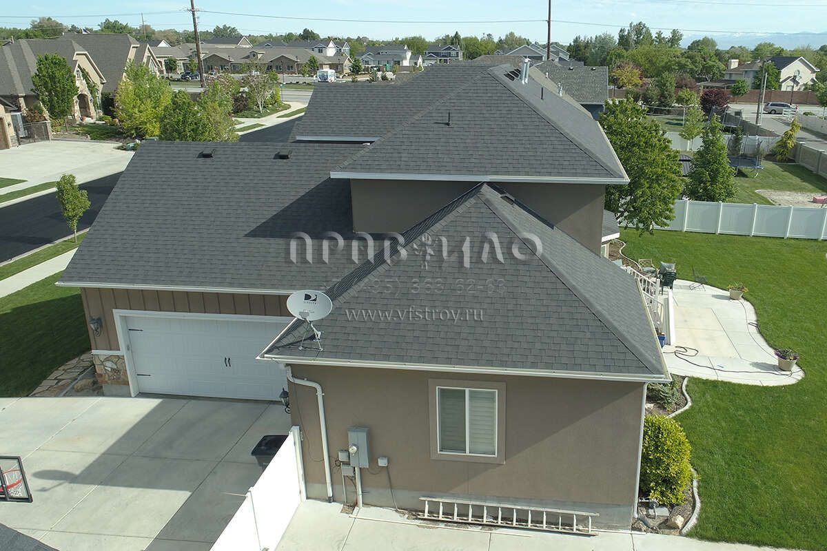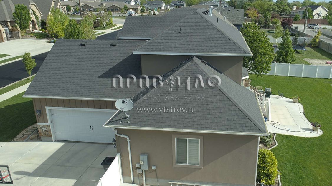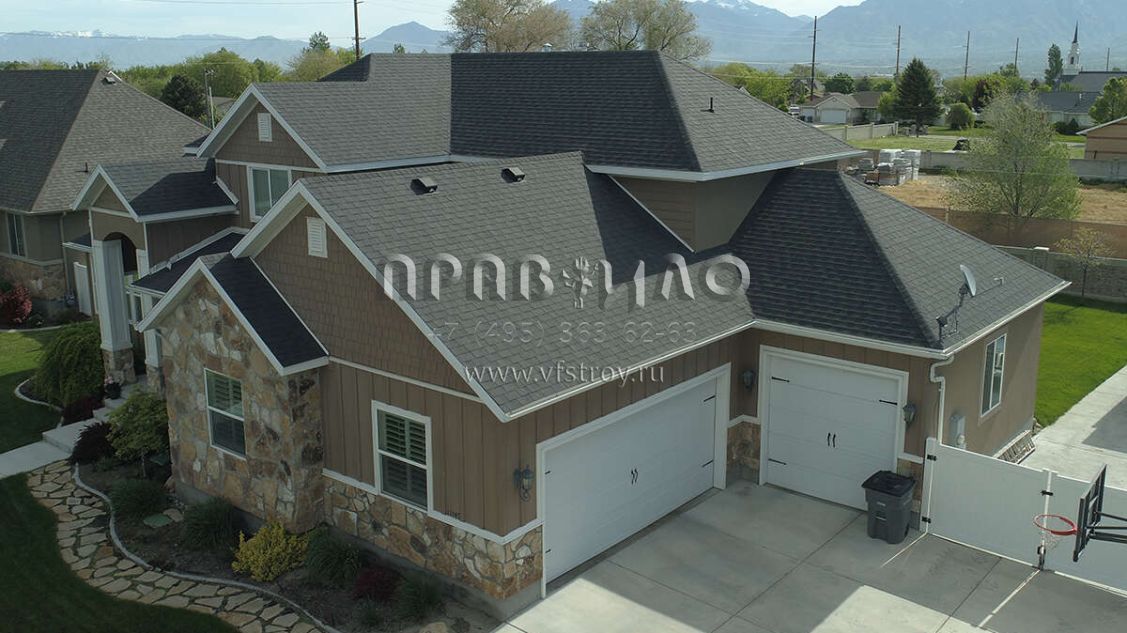 Это проект двухэтажного дома с гаражом на три и более машин жилой площадью 233 кв.м. Длина дома 14.3 м, ширина 22.3 м, высота 8.5 м. В доме четыре спальни и два санузла.