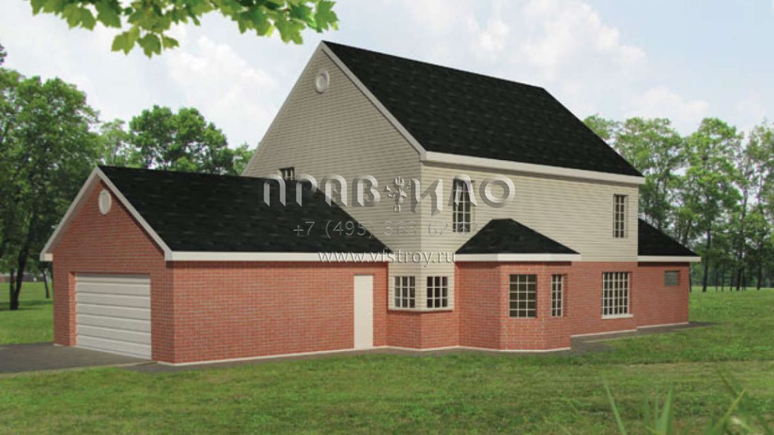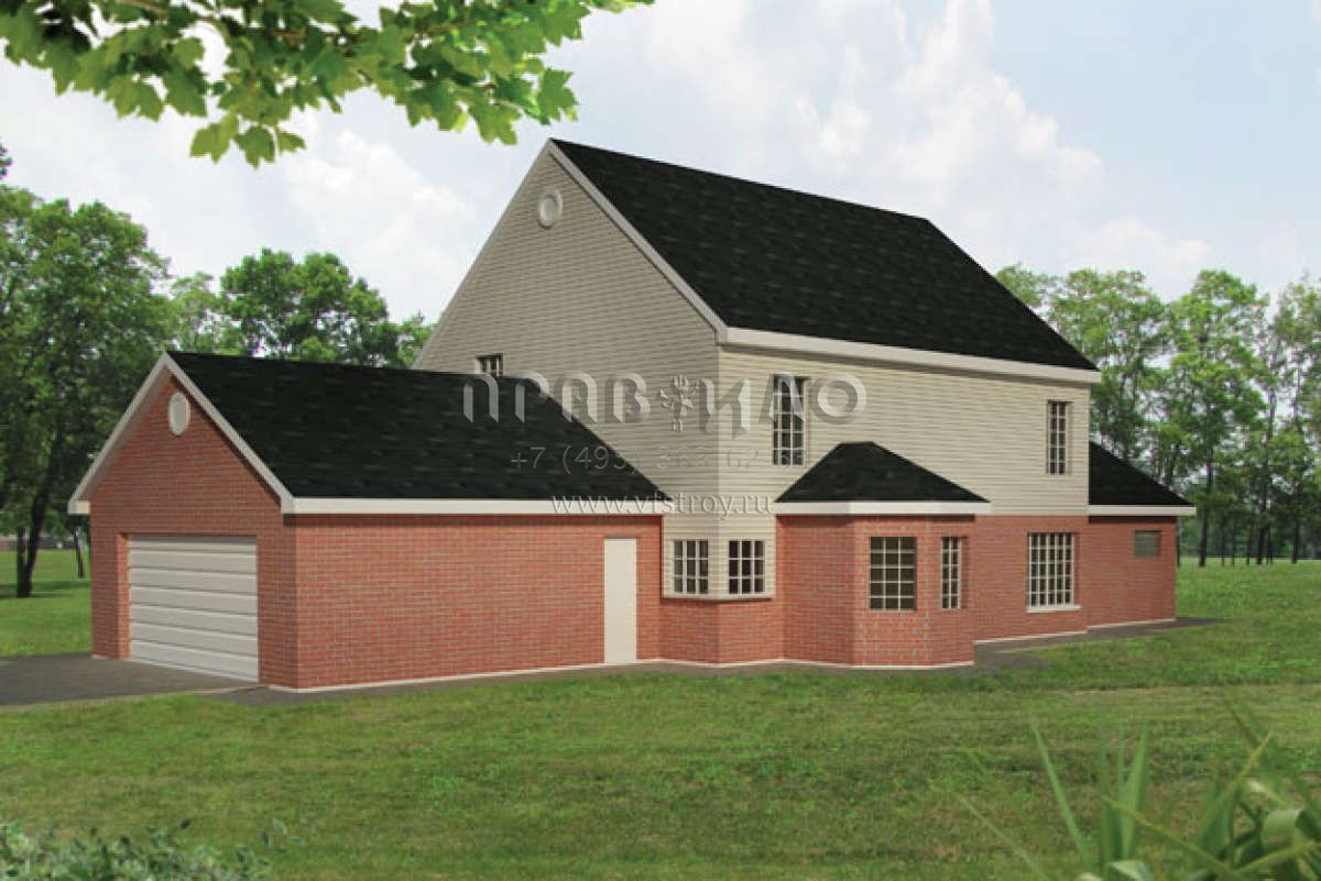 Это проект двухэтажного дома с гаражом на две машины жилой площадью 234 кв.м. Длина дома 10.7 м, ширина 14.3 м, высота 9.1 м. В доме четыре спальни и два санузла.