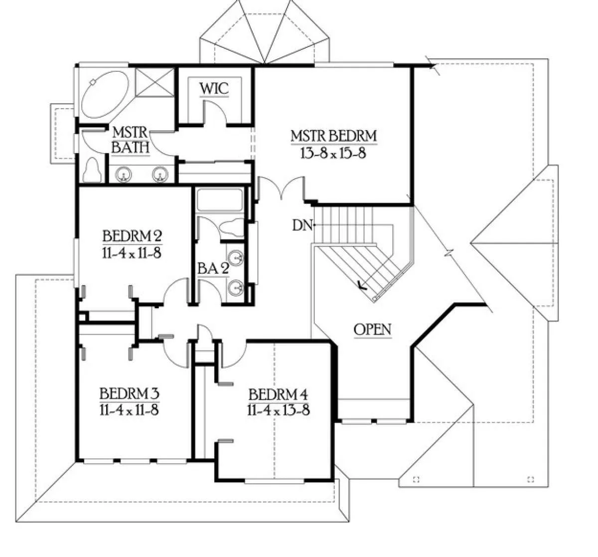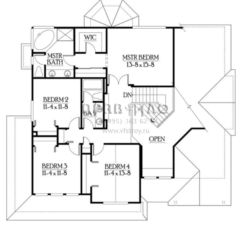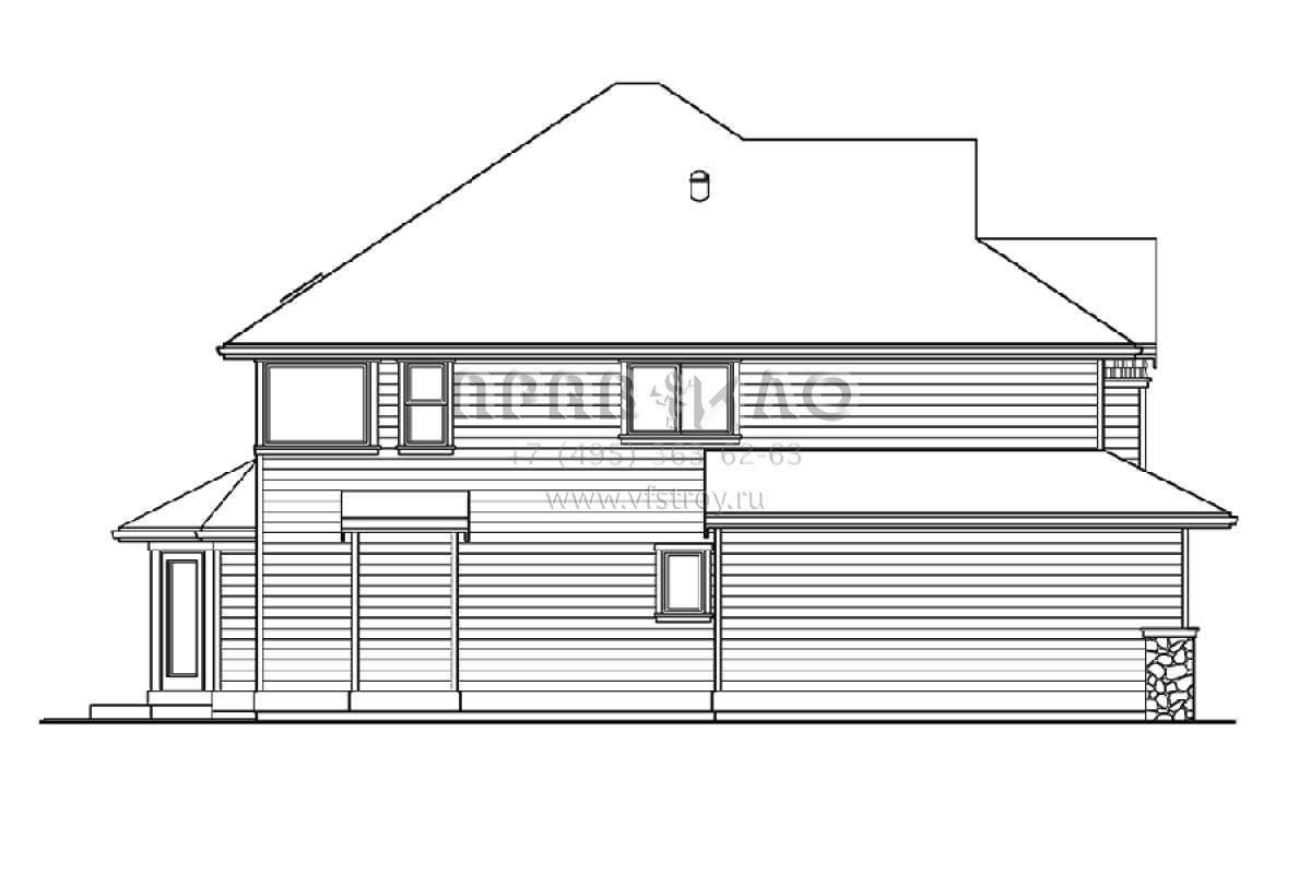 Это проект двухэтажного дома с гаражом на три и более машин жилой площадью 234 кв.м. Длина дома 14.9 м, ширина 15.8 м, высота 8.5 м. В доме четыре спальни и два санузла.