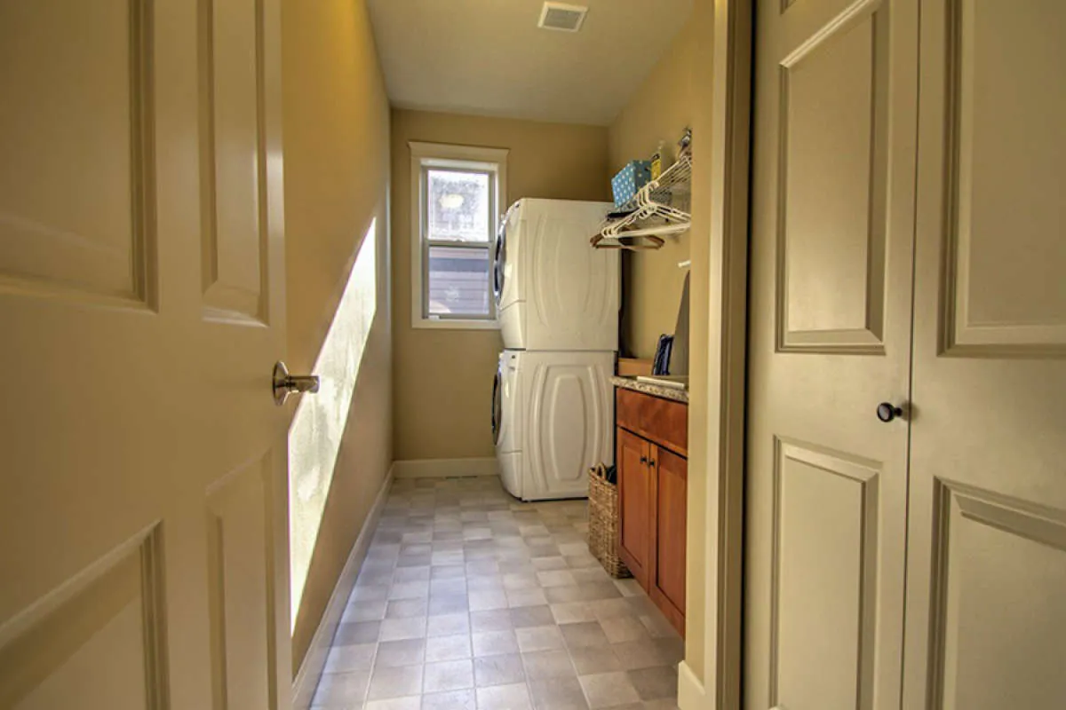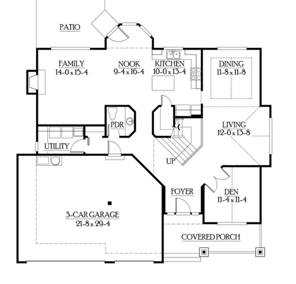 Двухэтажный проект дома позволяет рационально распорядиться площадью участка небольшого размера или узкой формы. На первом этаже находятся общие комнаты (гостиная/столовая, кухня, подсобные и технические помещения), на втором — спальни членов семьи.