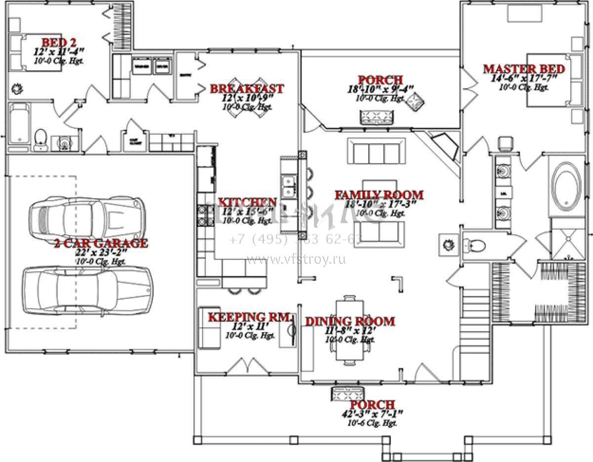 S5-238 (1070-00211) Это иностранный проект, для которого требуется адаптация под нормы, действующие в Российской Федерации. Вы видите проект дома в стиле Ранчо. В этом доме сочетаются черты сельской постройки и аскетичность лофта. Внутри жильцы смогут проводить время с максимальным комфортом. Обратим внимание, что сейчас на планировках все размеры представлены в футах. Для перевода в метры вам необходимо значение в футах умножить на 0,3048.