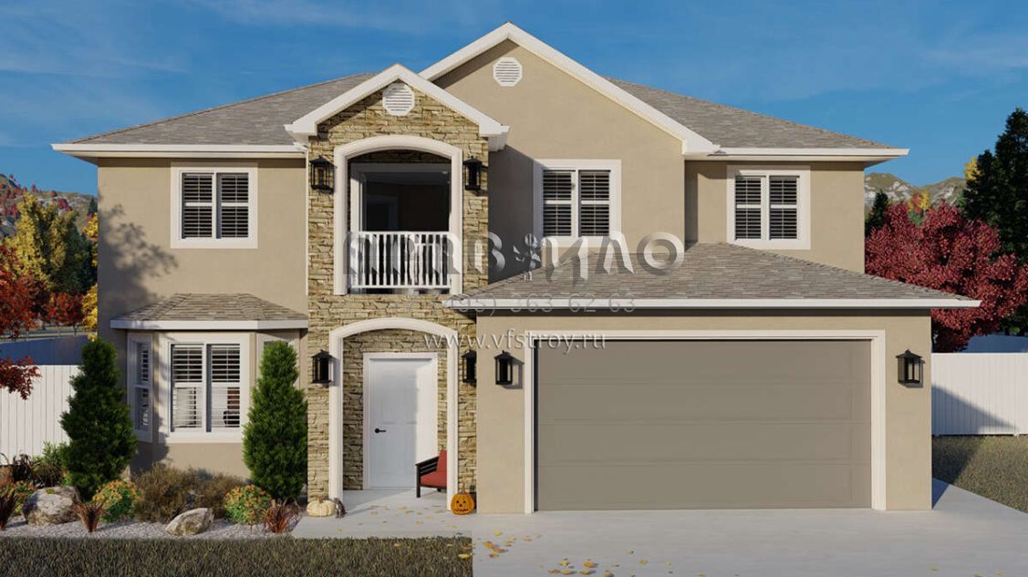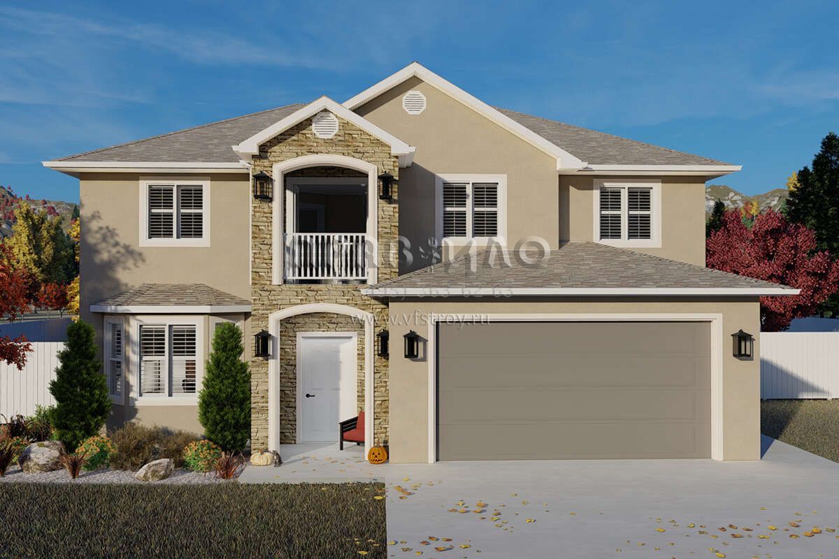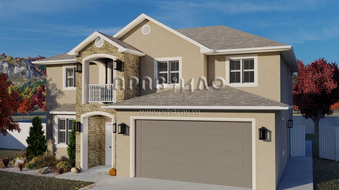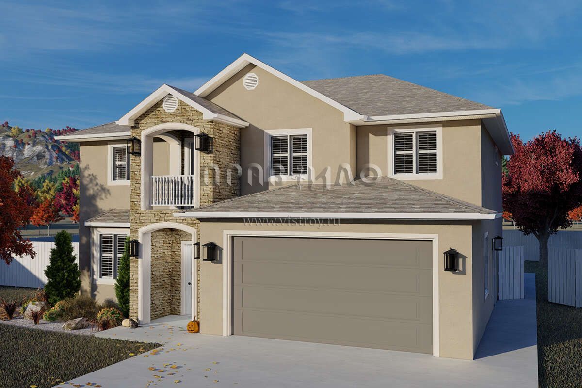 Это проект двухэтажного дома с гаражом на две машины жилой площадью 238 кв.м. Длина дома 12.8 м, ширина 13.1 м, высота 7.6 м. В доме четыре спальни и два санузла.
